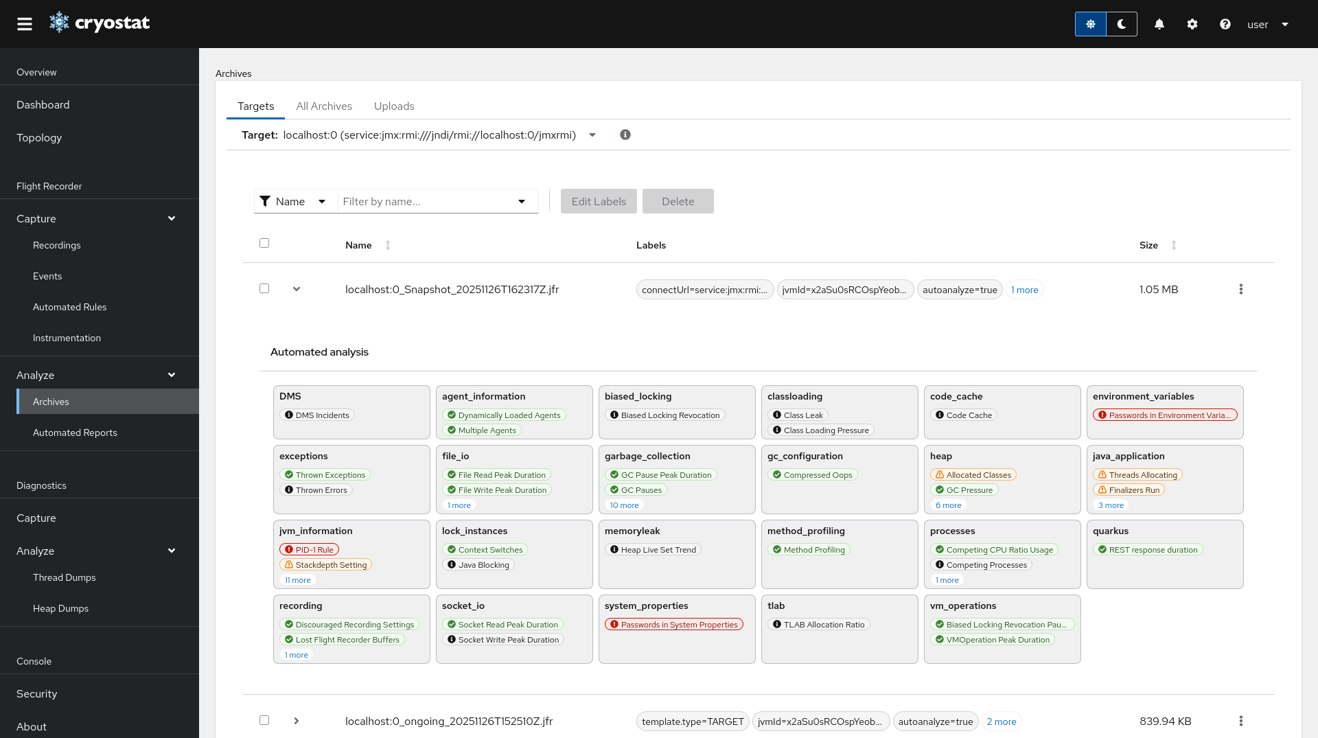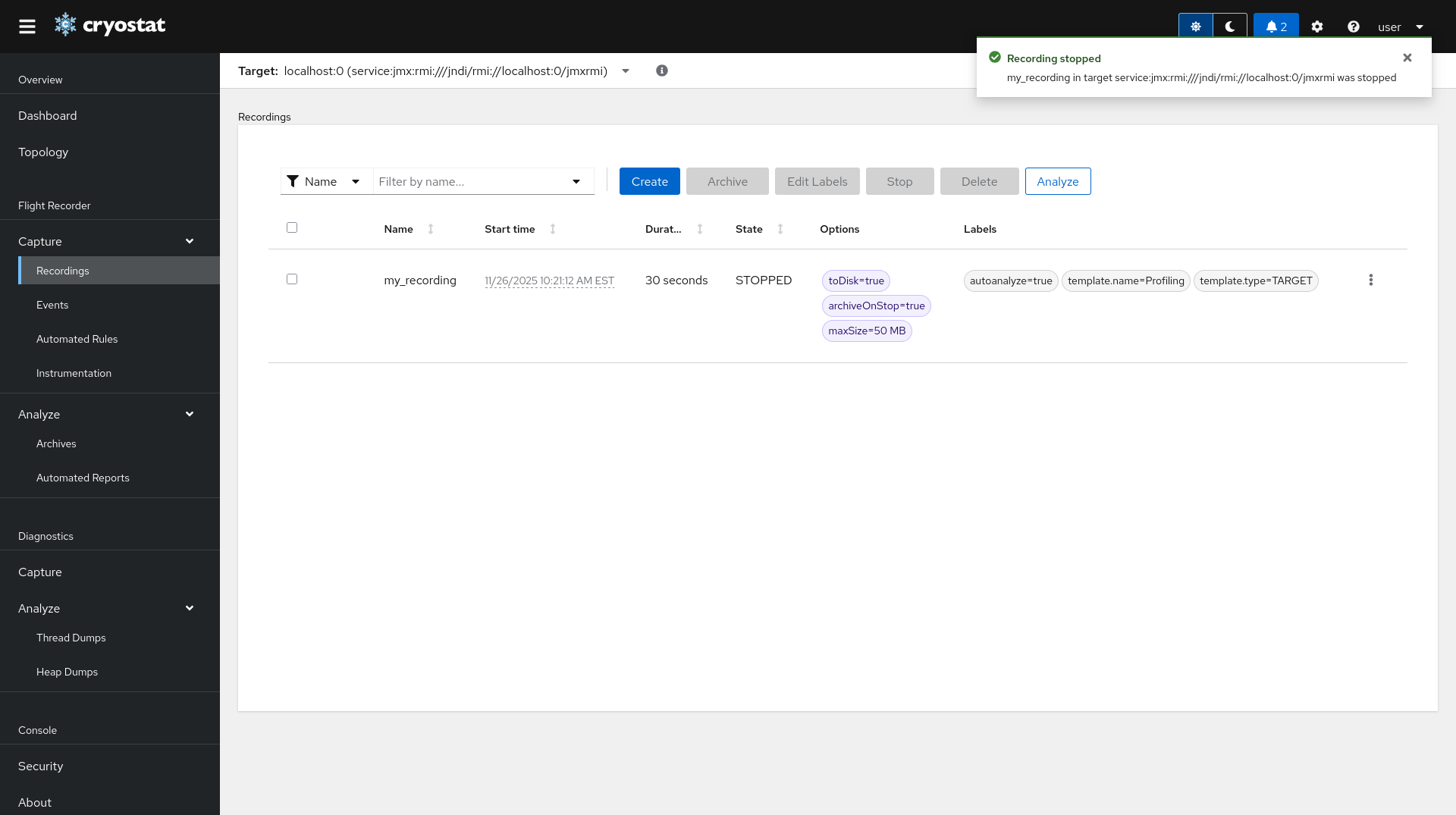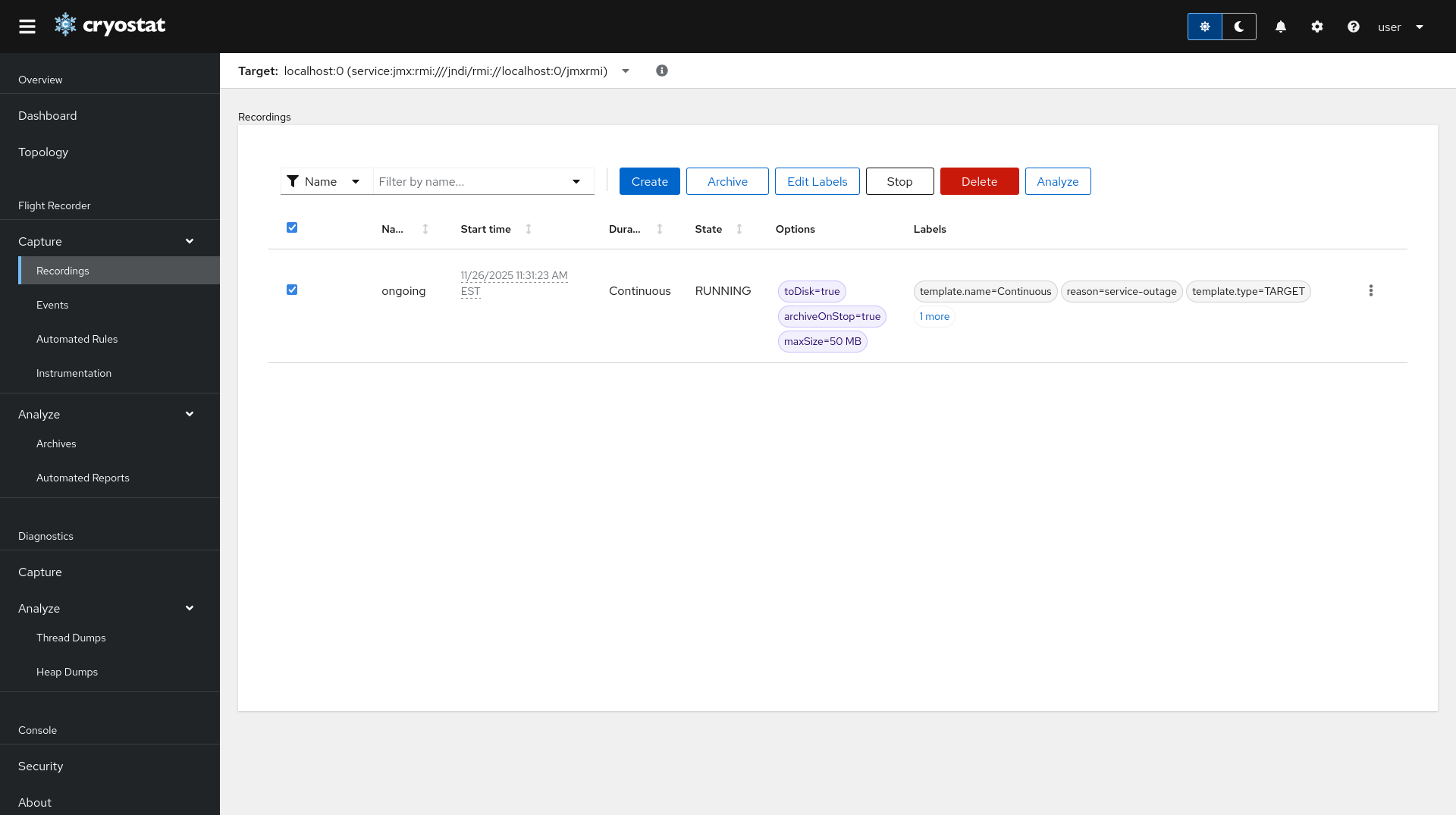 Once you’ve created a rule, Cryostat immediately matches it against all existing discovered targets and starts your Flight Recording. Cryostat will also apply the rule to newly discovered targets that match its definition. You can create multiple rules to match different subsets of targets or to layer different recording options for your needs.