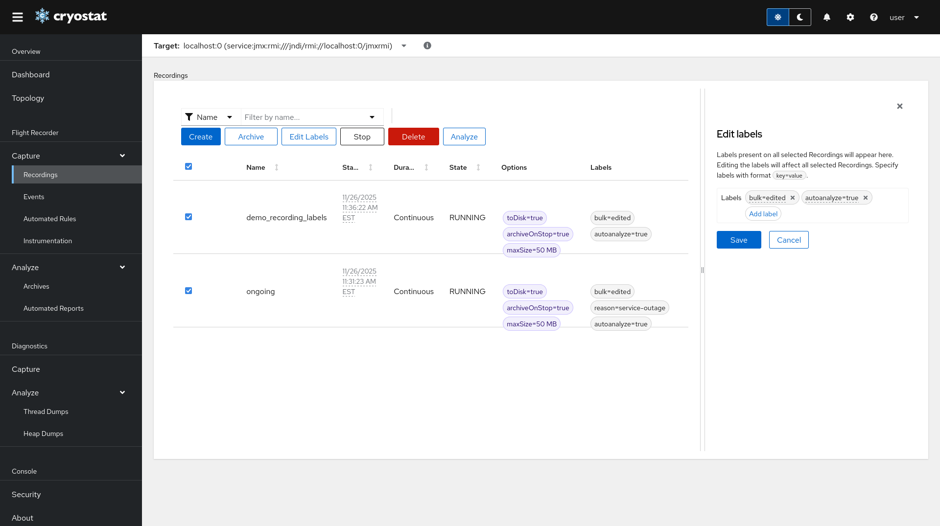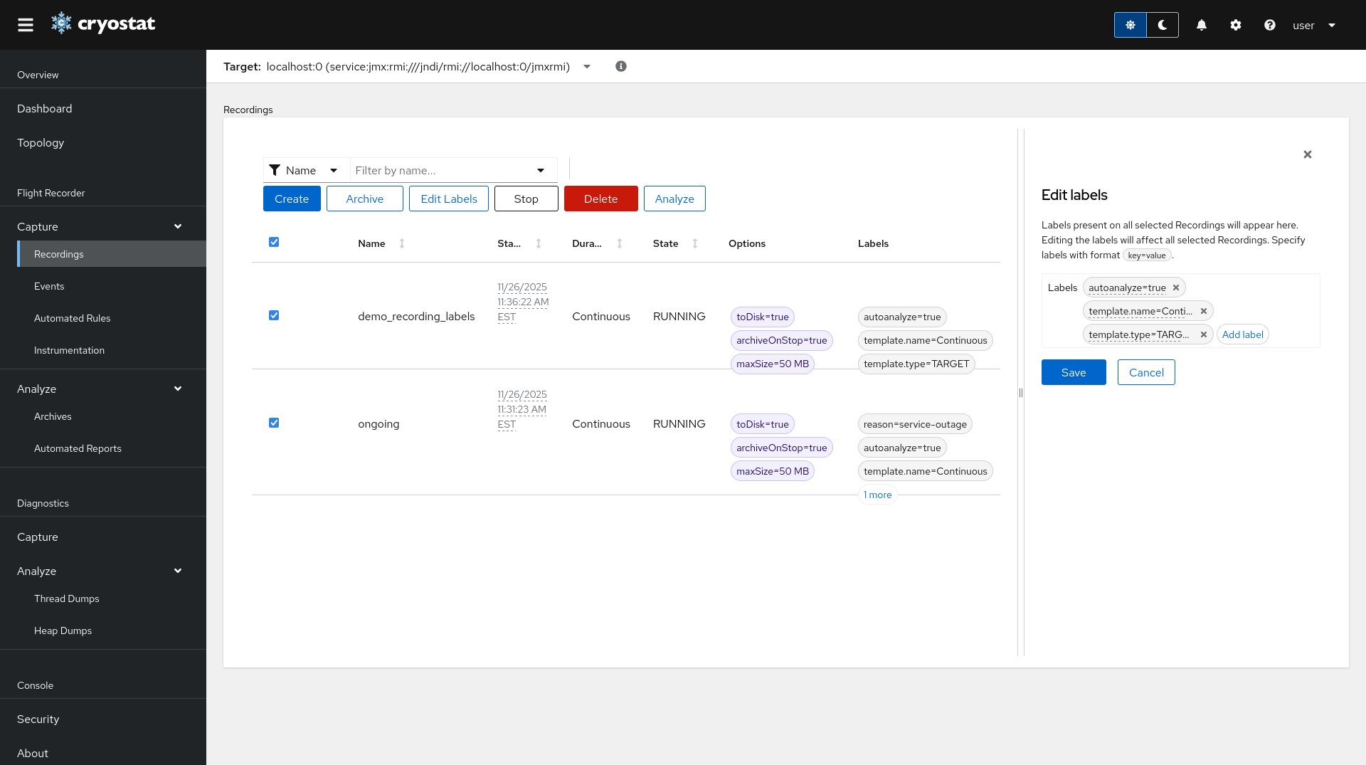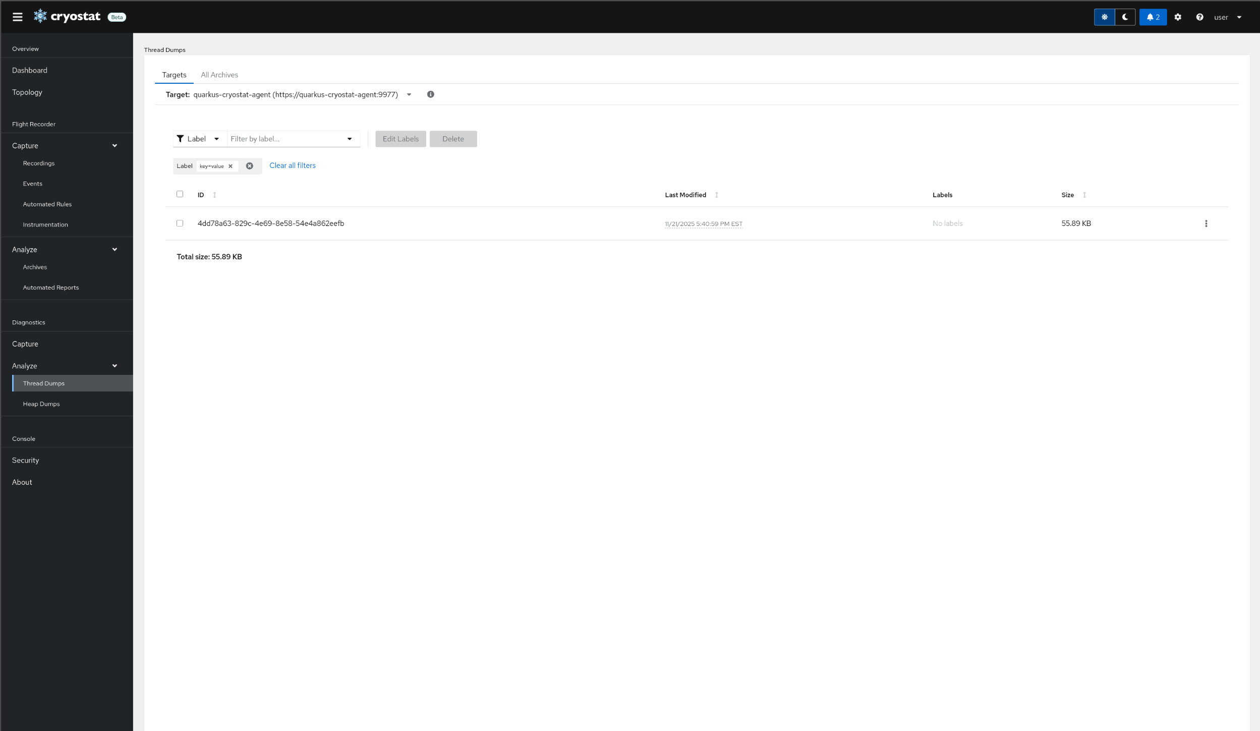 The name of the Thread Dump when downloaded reflects the address of the target application. Thread dumps also support labels similar to Archived Recordings. See