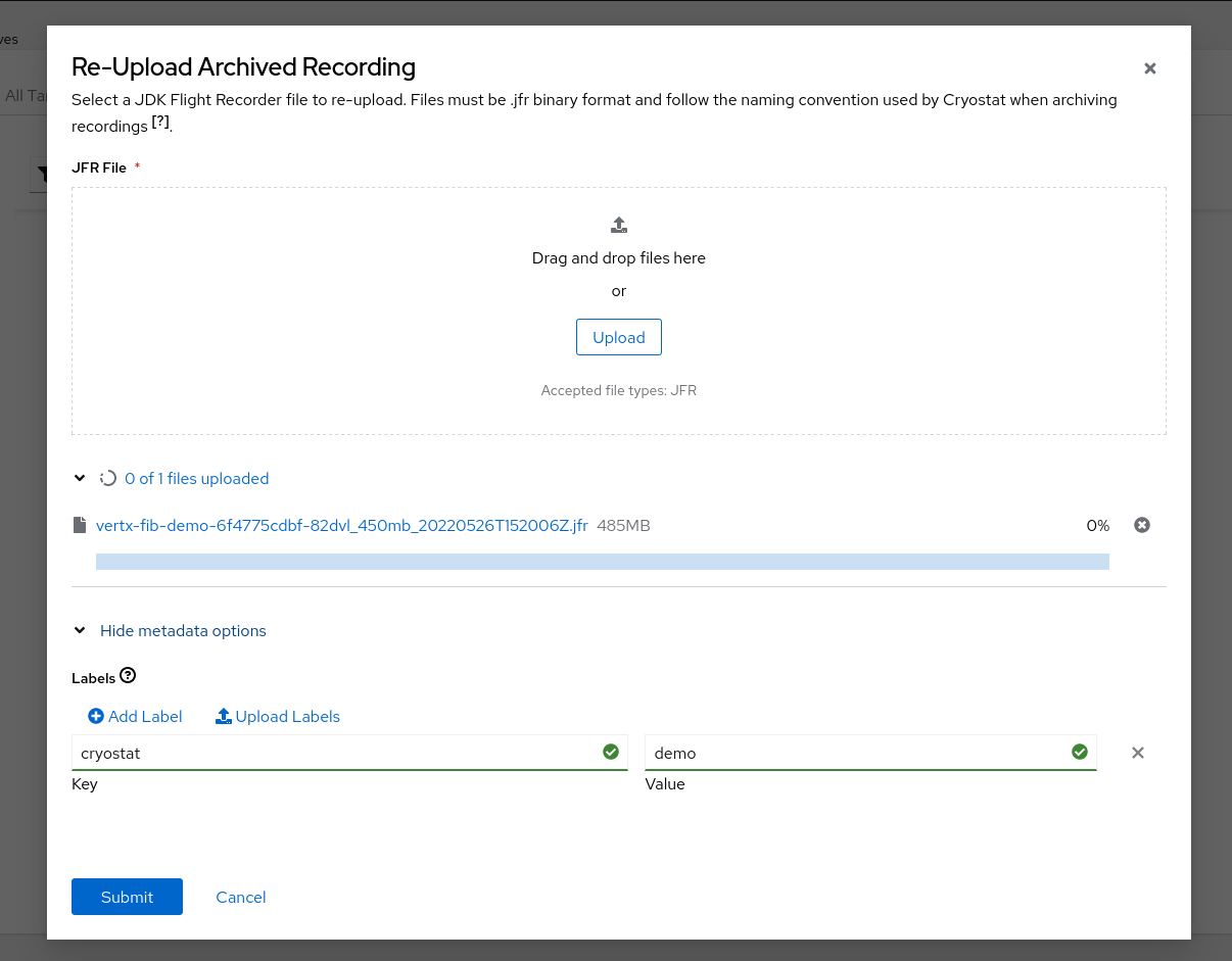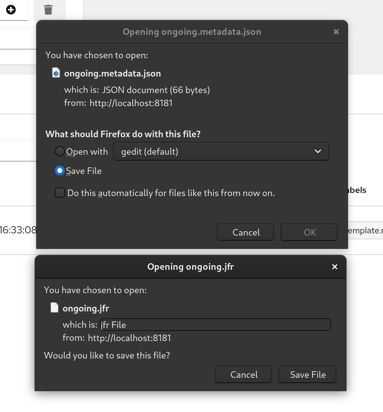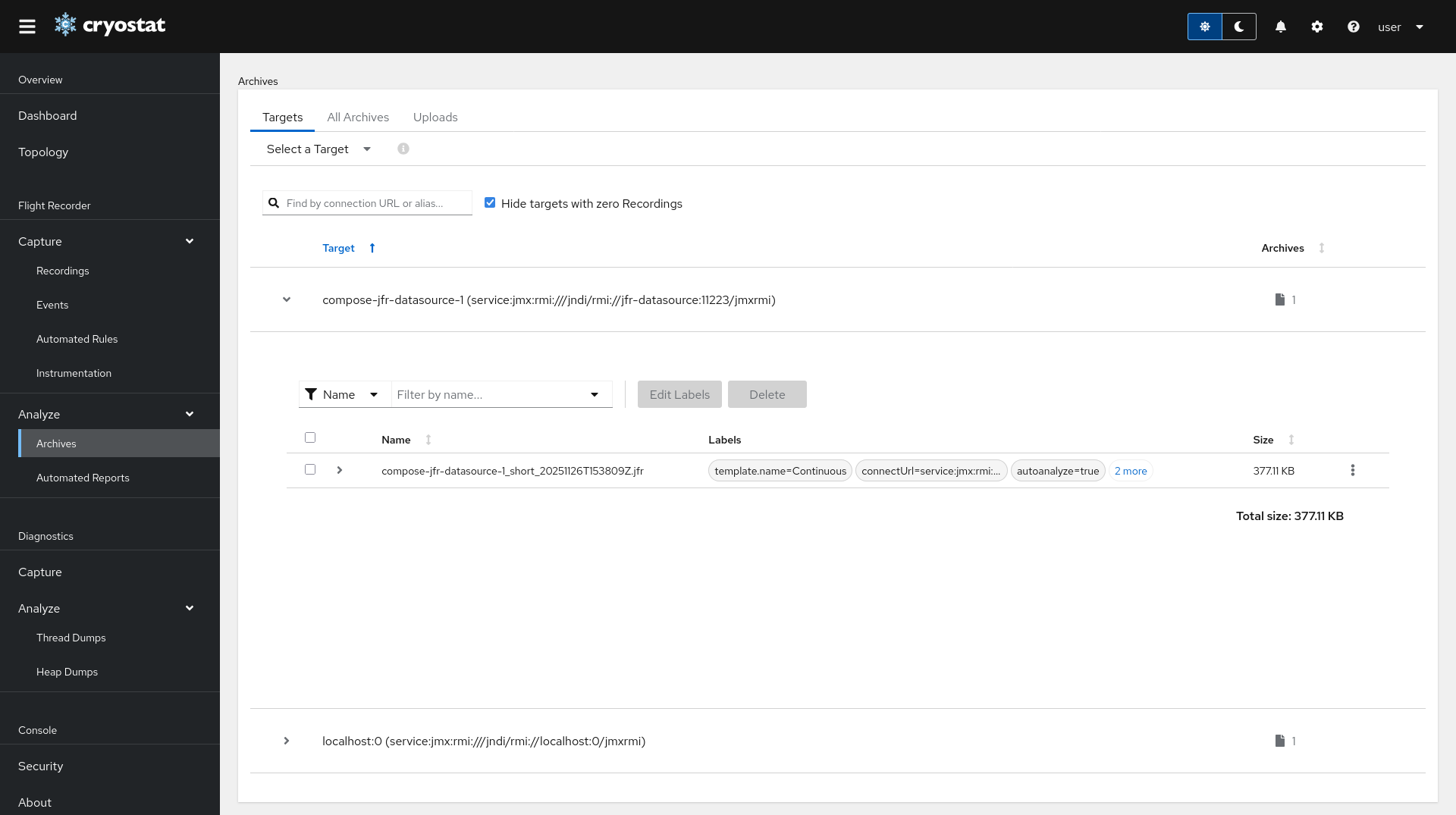 The name of the Thread Dump when downloaded reflects the address of the target application. Thread dumps also support labels similar to Archived Recordings. See
