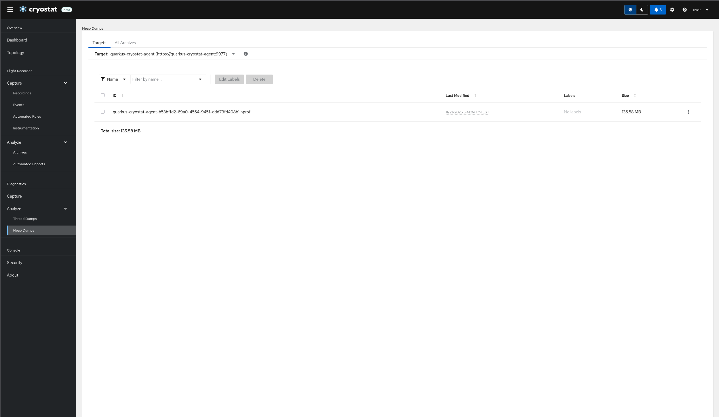 The name of the Heap Dump reflects the address of the target application. Heap dumps also support labels similar to Archived Recordings. See