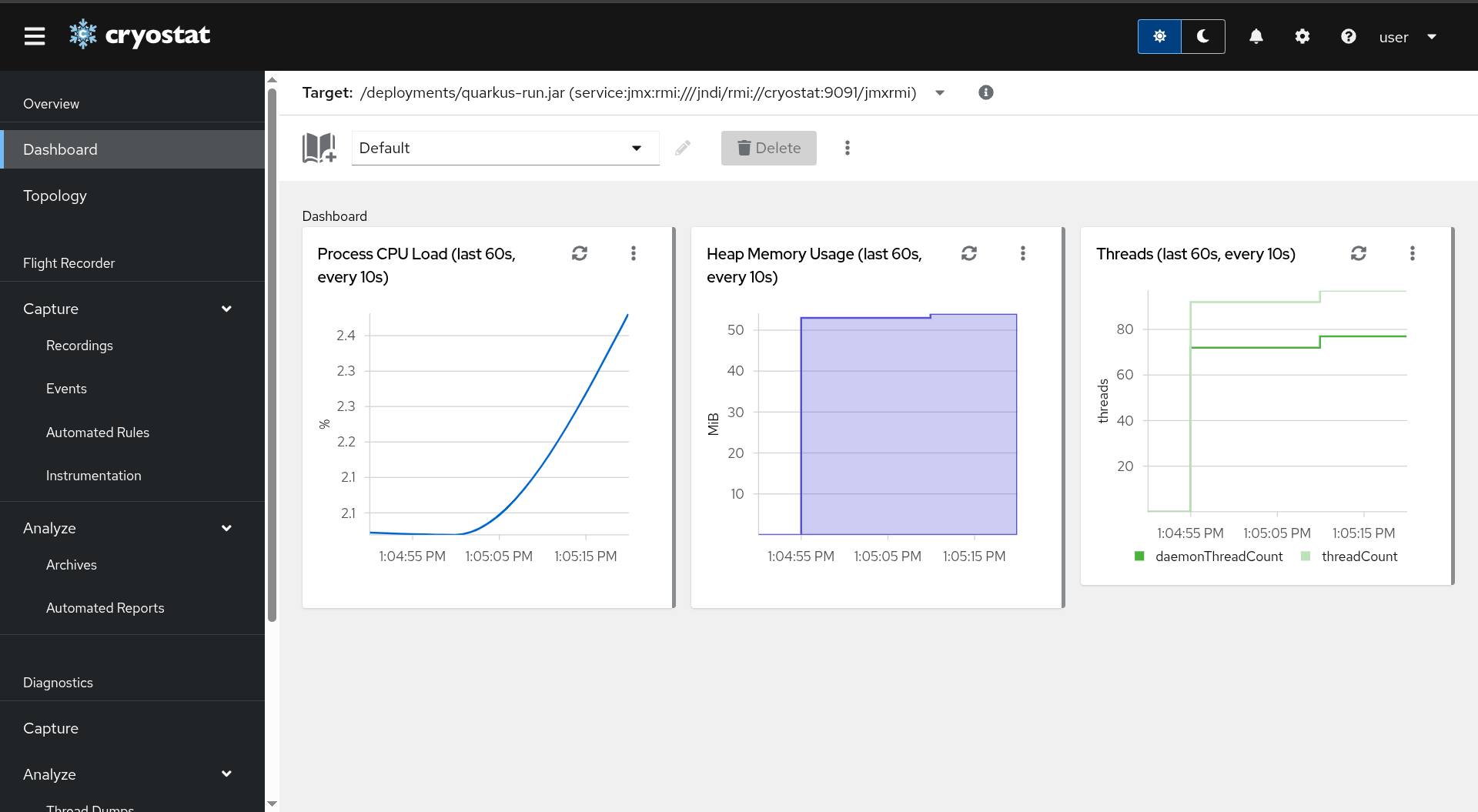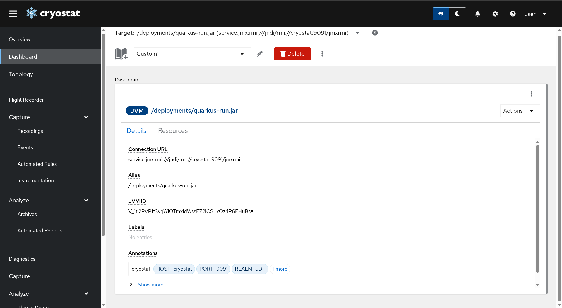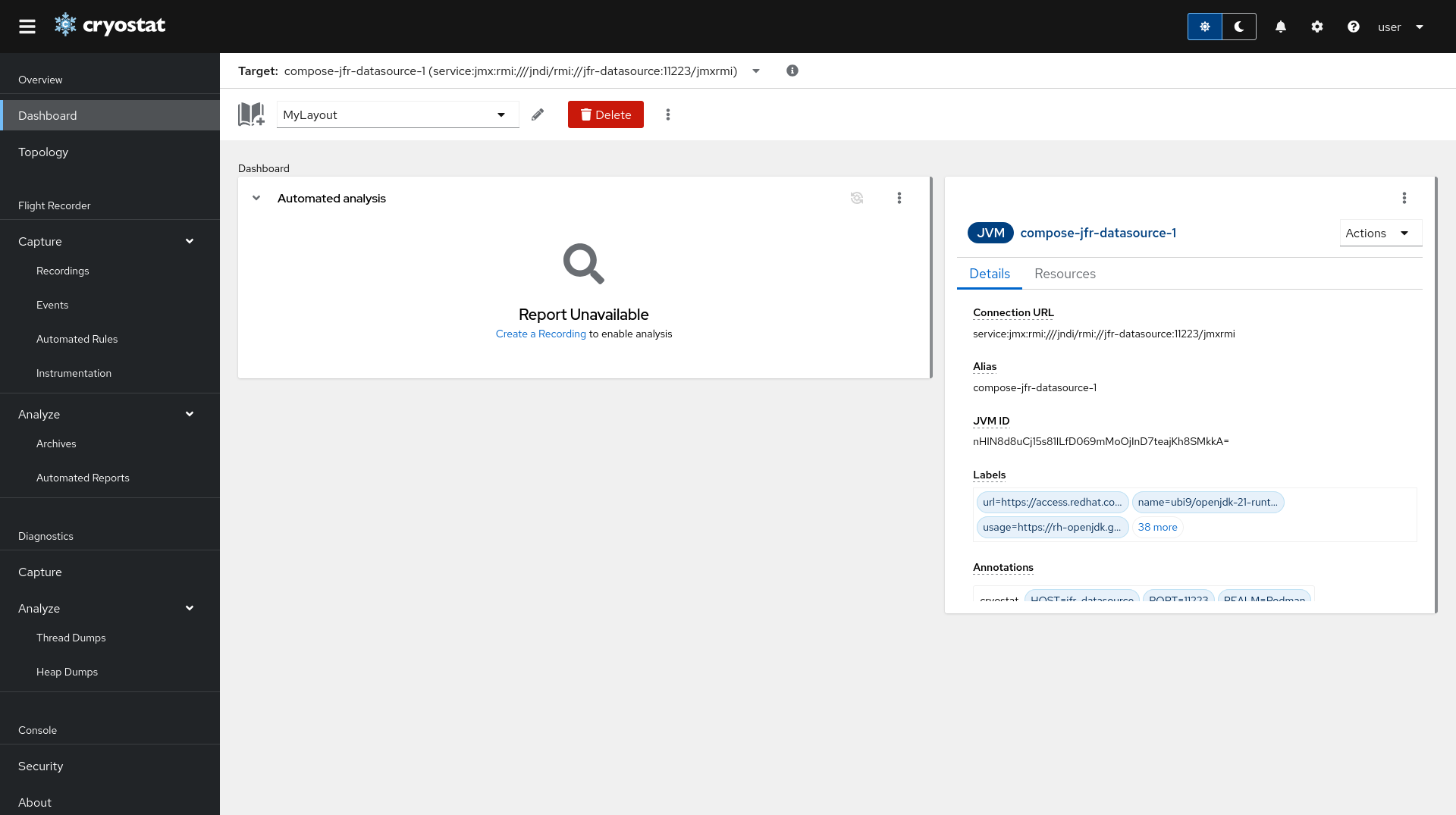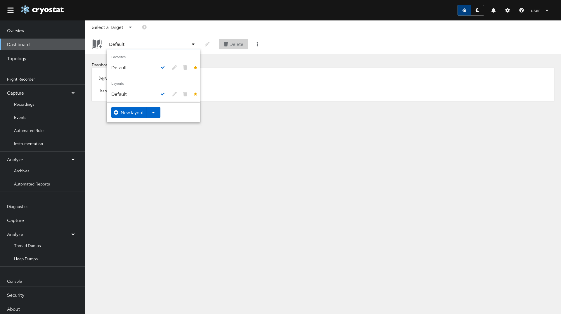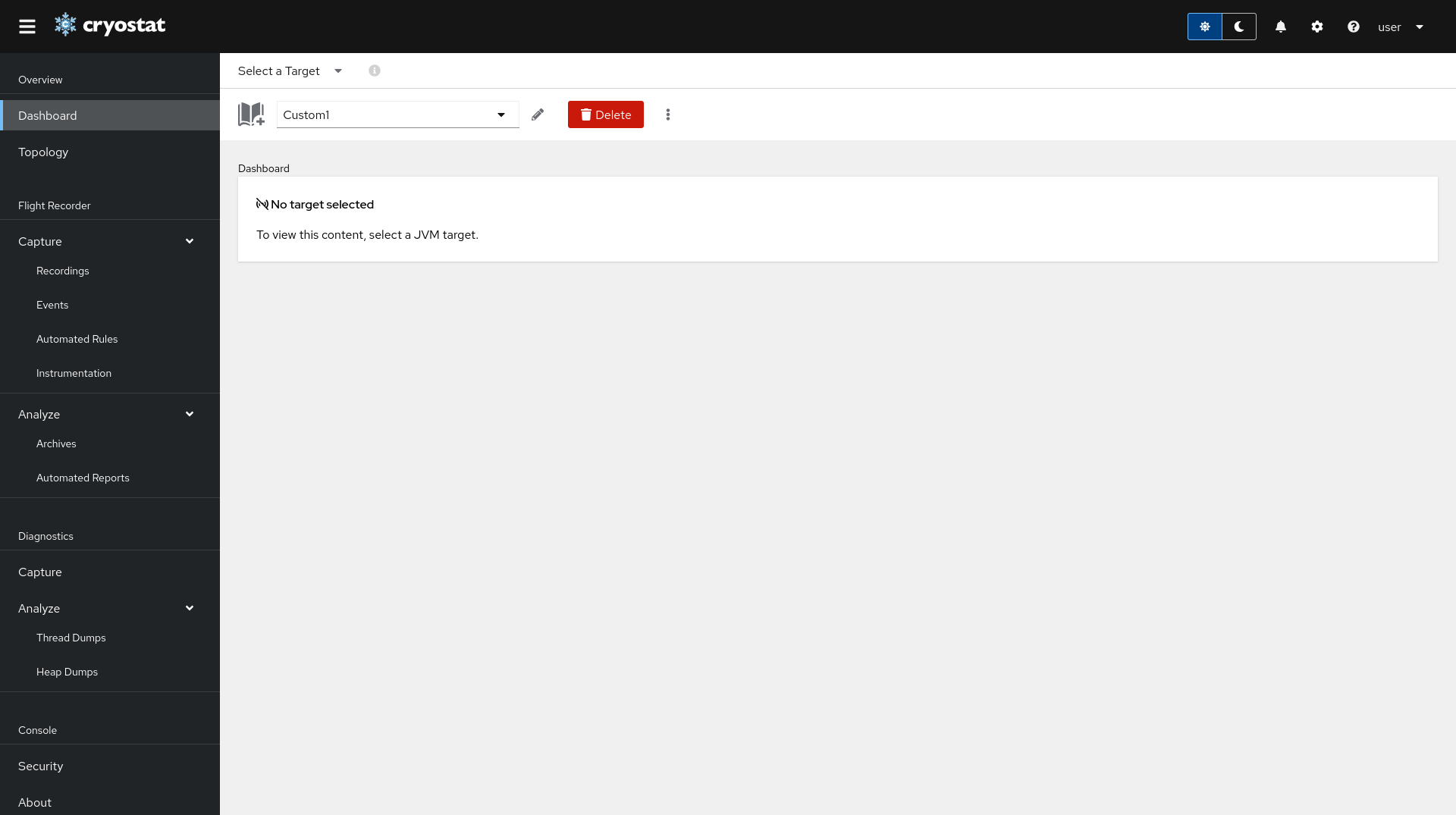 The Dashboard is the first view you will see when you log into Cryostat. It provides a high-level overview of the state of your Cryostat instance and the targetJVM applications it is monitoring.