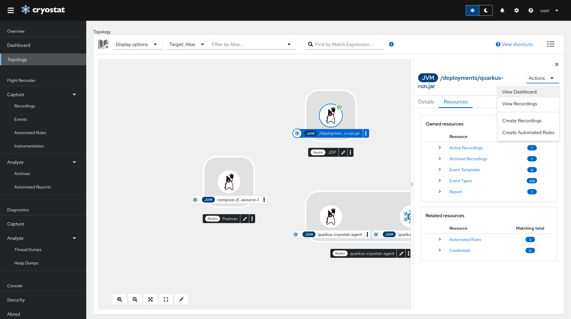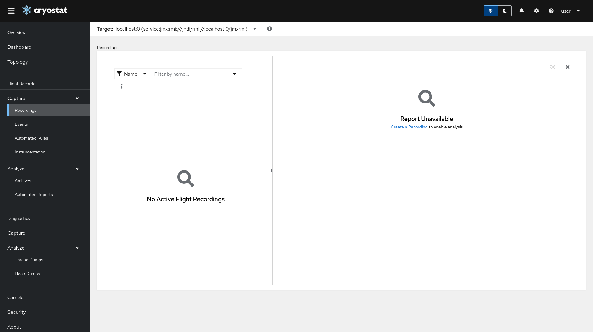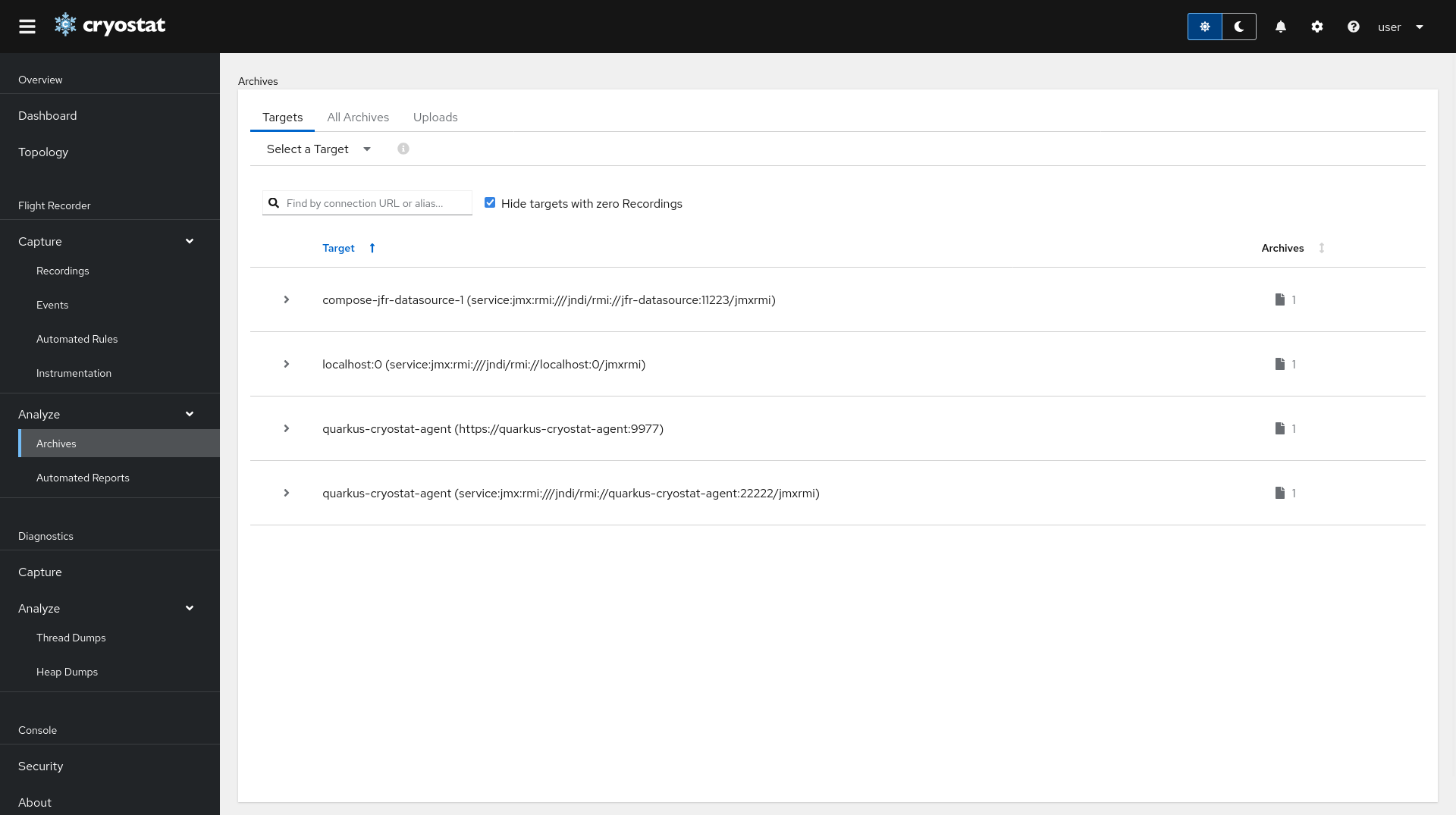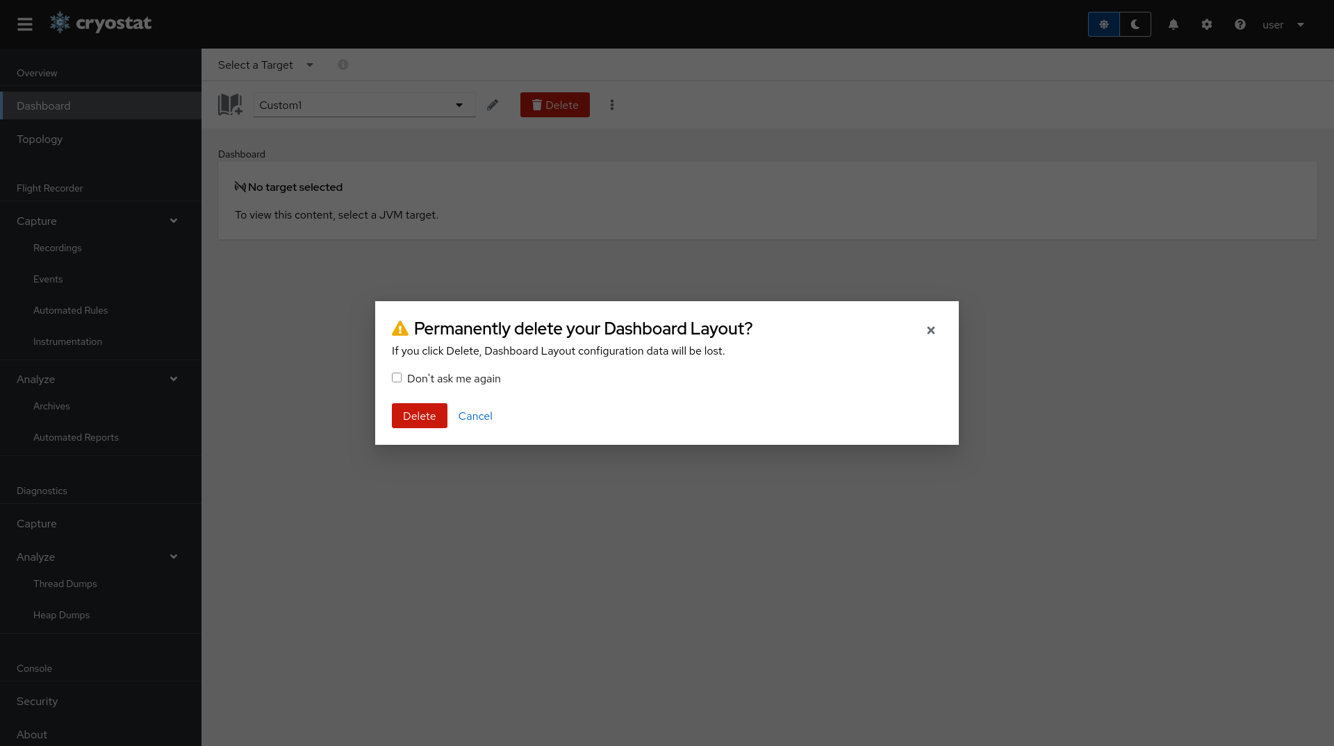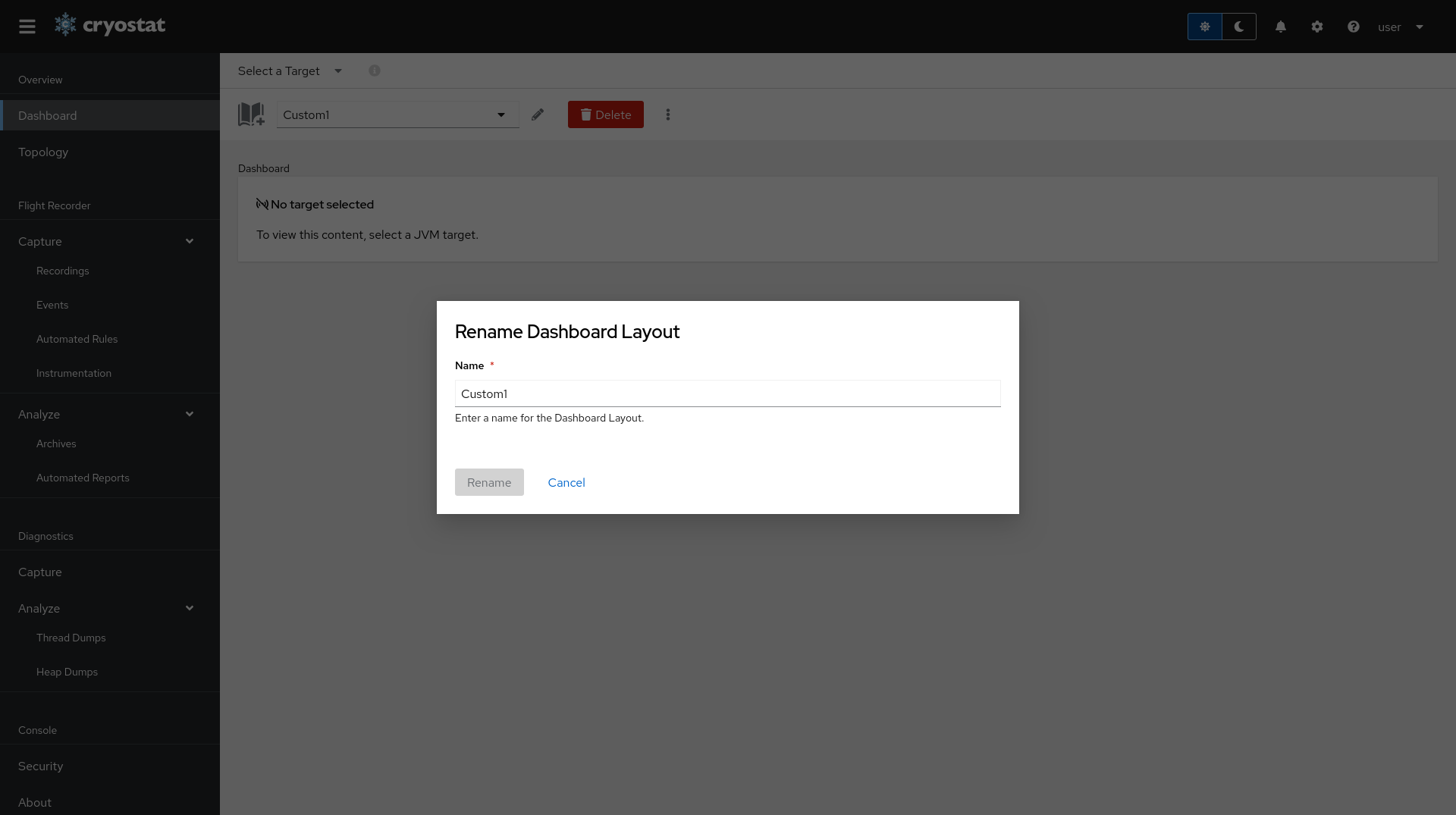 The Dashboard is the first view you will see when you log into Cryostat. It provides a high-level overview of the state of your Cryostat instance and the targetJVM applications it is monitoring.