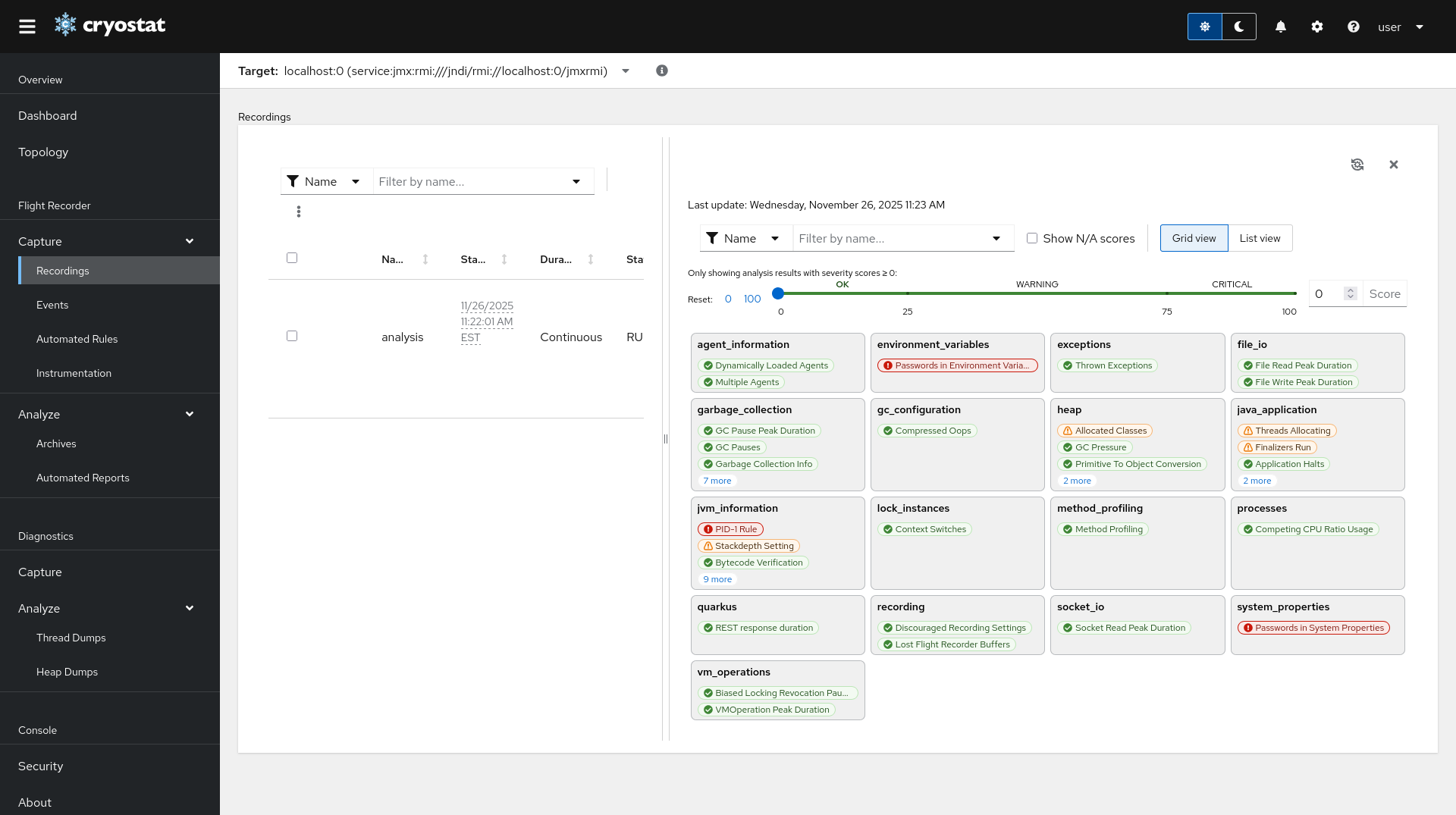 Previously, if we wanted to enable always-on Continuous monitoring using JDK Flight Recorder (JFR) in a containerized Java virtual machine (JVM), we would set JVM flags on the target application, then restart the application to start monitoring. With Cryostat’sAutomated Rules, we can enable JDK Flight Recorder (JFR) at runtime to continuously monitor an already-running target application, with no restart, no redeploy, and no downtime.