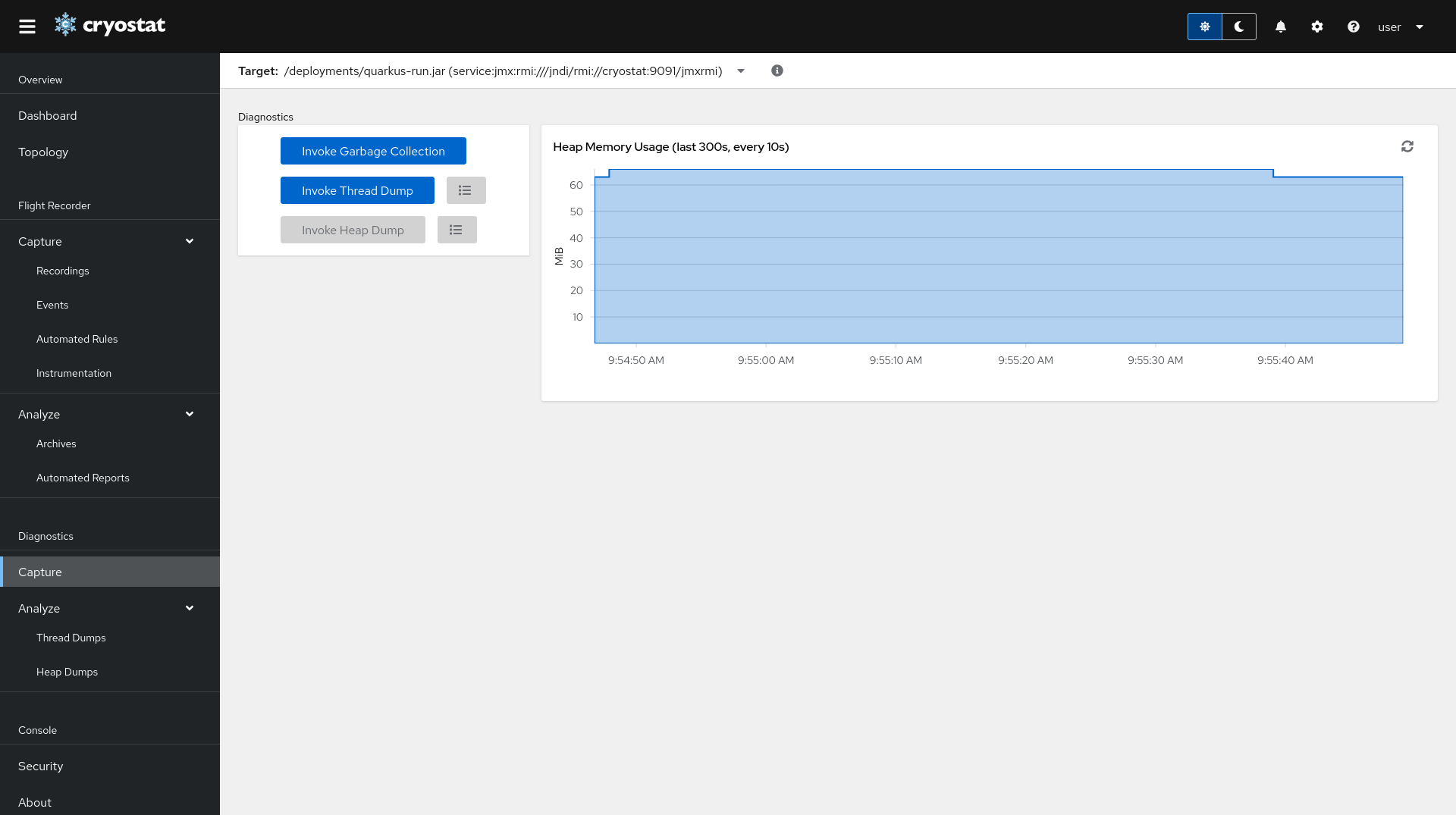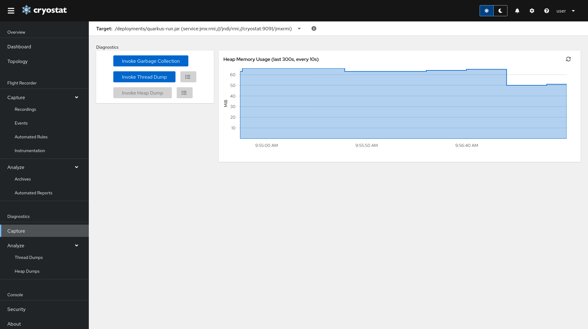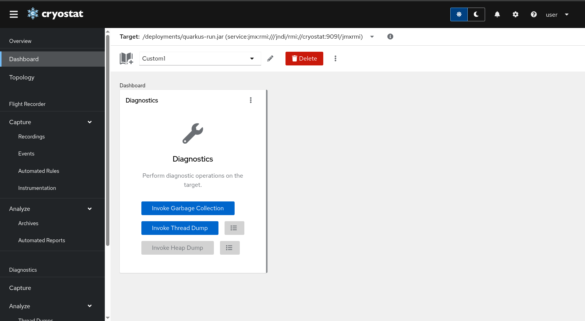 Currently Cryostat supports invoking garbage collection, capturing Thread Dumps, and capturing Heap Dumps on targetJVMs. Capturing Heap Dumps additionally requires a Cryostat Agent connection.