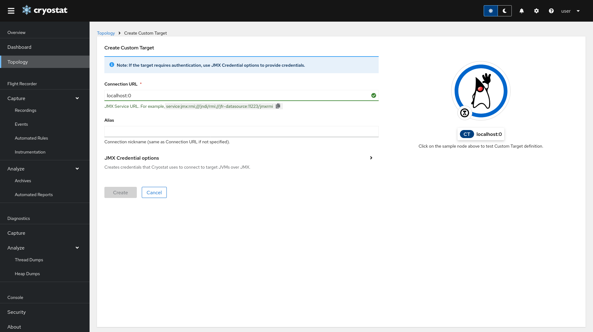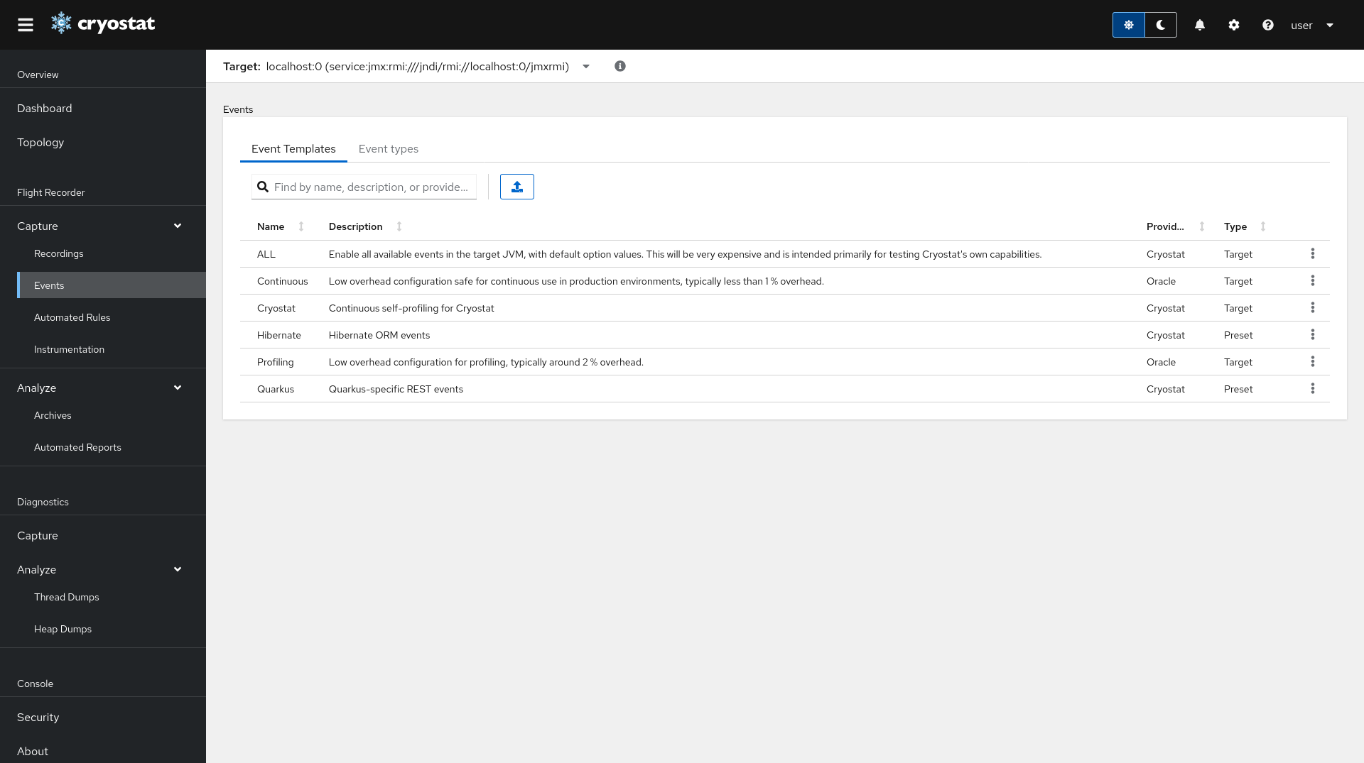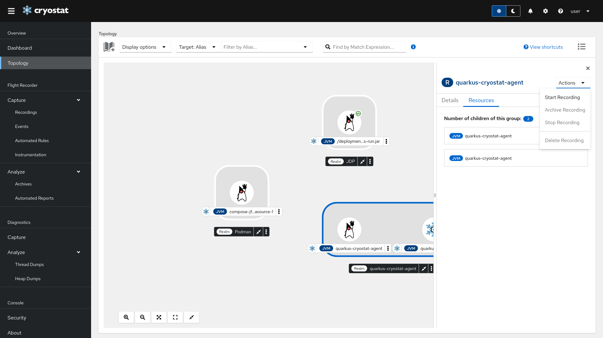 Currently Cryostat supports invoking garbage collection, capturing Thread Dumps, and capturing Heap Dumps on targetJVMs. Capturing Heap Dumps additionally requires a Cryostat Agent connection.