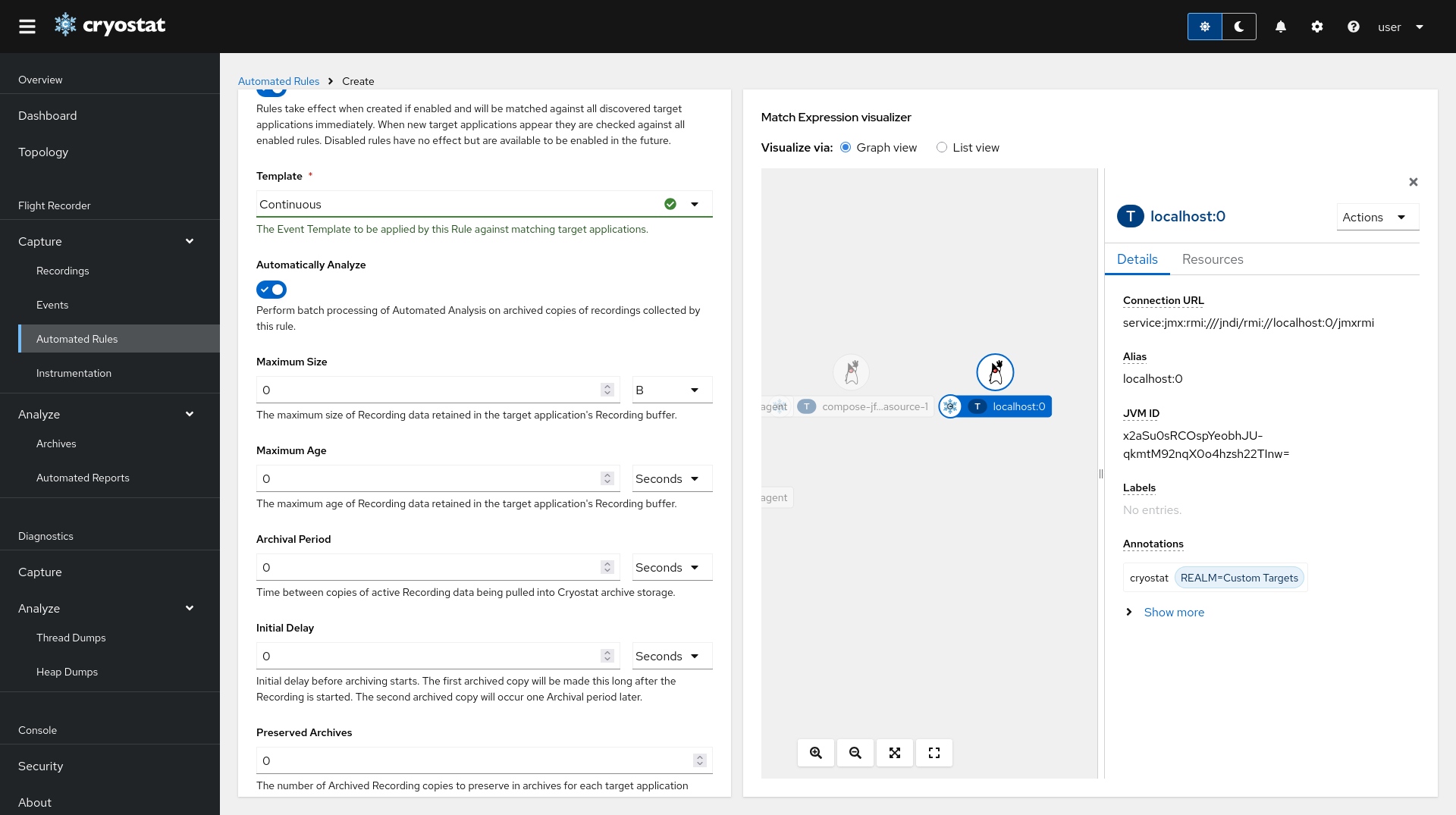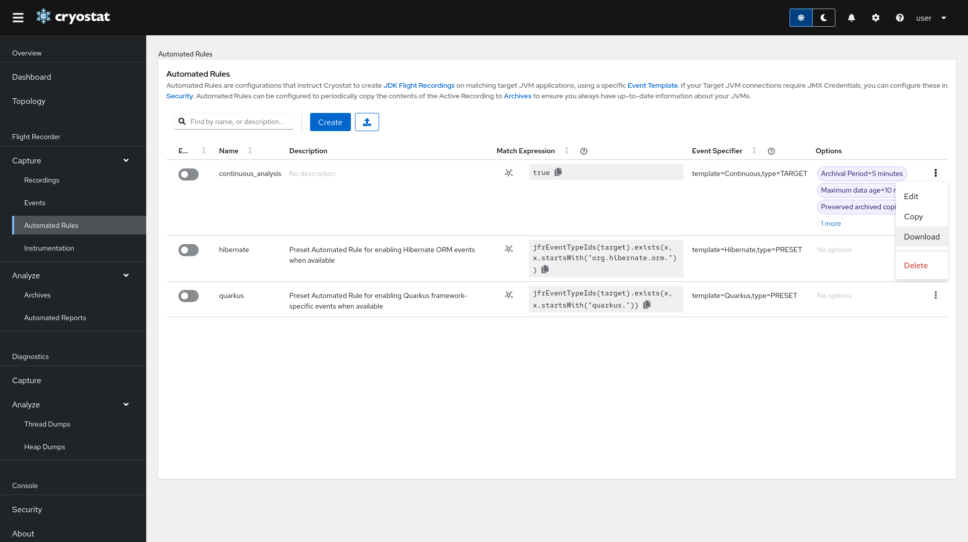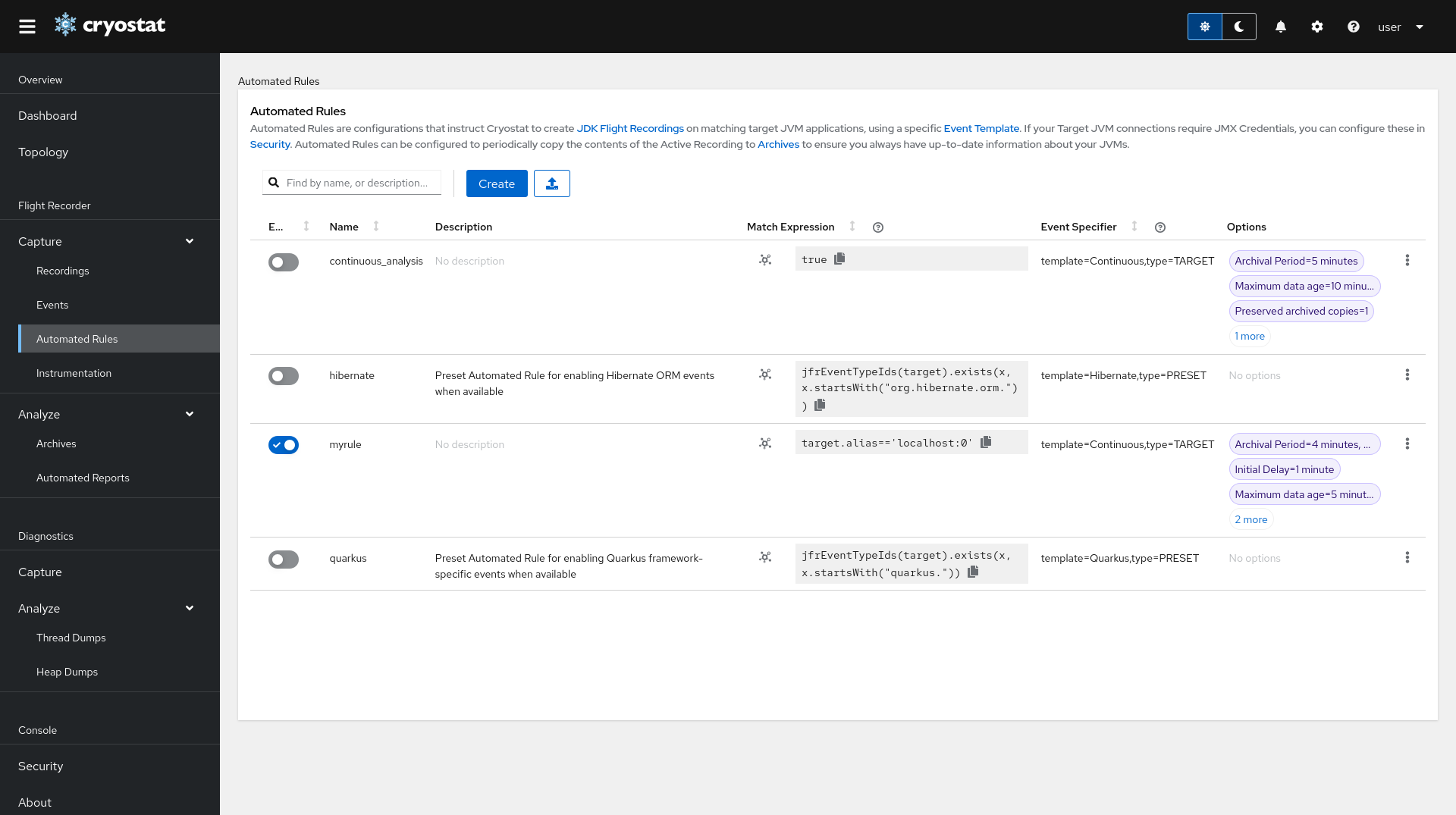Automated Rules are configurations that instruct Cryostat to create JDKFlight Recordings on matching