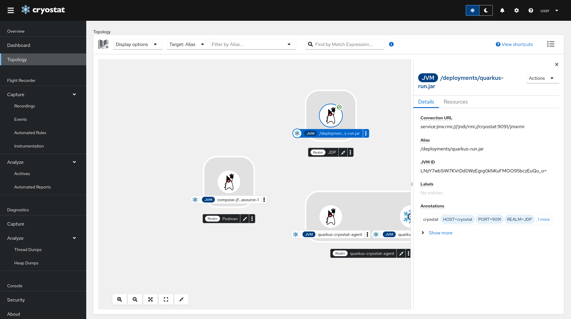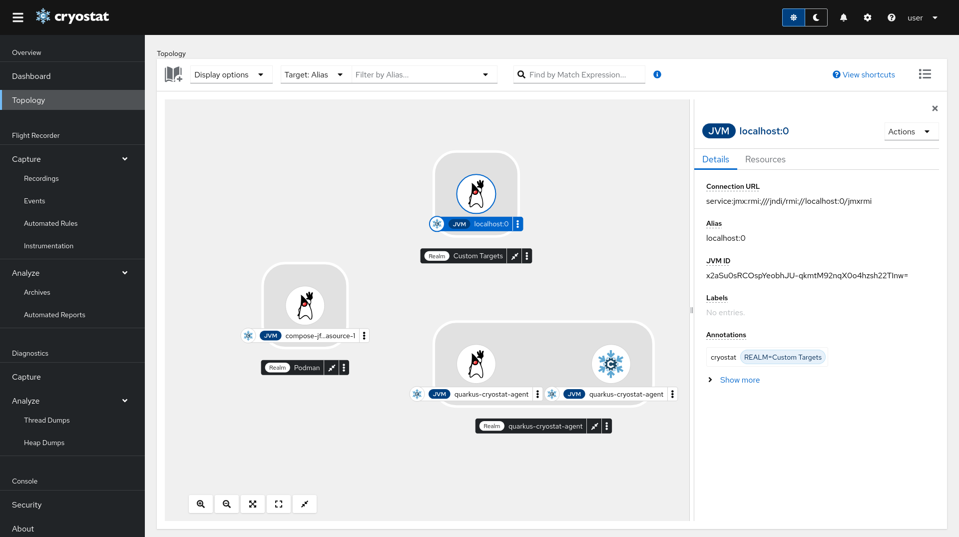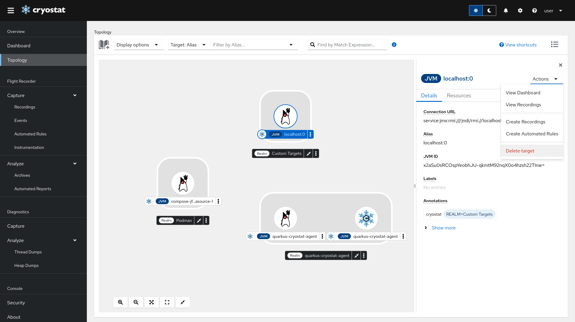 The alias, connectUrl, labels, annotations.platform, and annotations.cryostat properties are all guaranteed to be present on the target object. alias and connectUrl will be non-empty strings. The jvmId is a hash string computed by Cryostat after it successfully connects to a targetJVM and is used to uniquely identify that JVM instance - it will be empty if Cryostat has not yet connected to that target (for example, if its SSL/TLS certificate is not trusted or if Cryostat is missing the required credentials) The labels and platform annotations may be empty — in OpenShift or Kubernetes, these are populated from the labels and annotations applied to the target’s pod, if any. The Cryostat annotations map will vary per platform, but on OpenShift or Kubernetes you can expect the HOST, PORT, NAMESPACE, and POD_NAME keys to be present and non-empty. Take care to use the has or in operators when dealing with the labels and annotations map structures where specific keys may not exist.