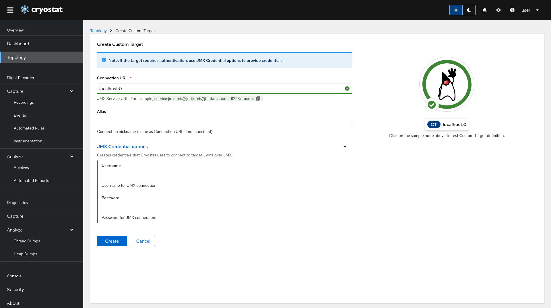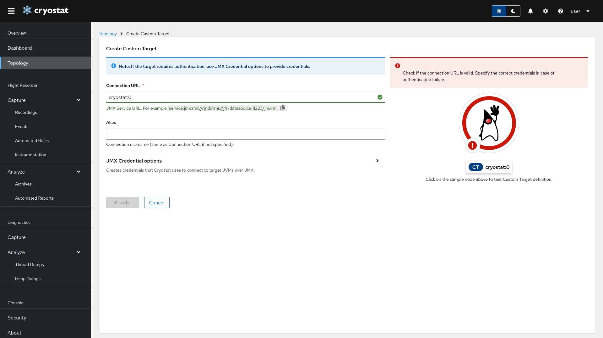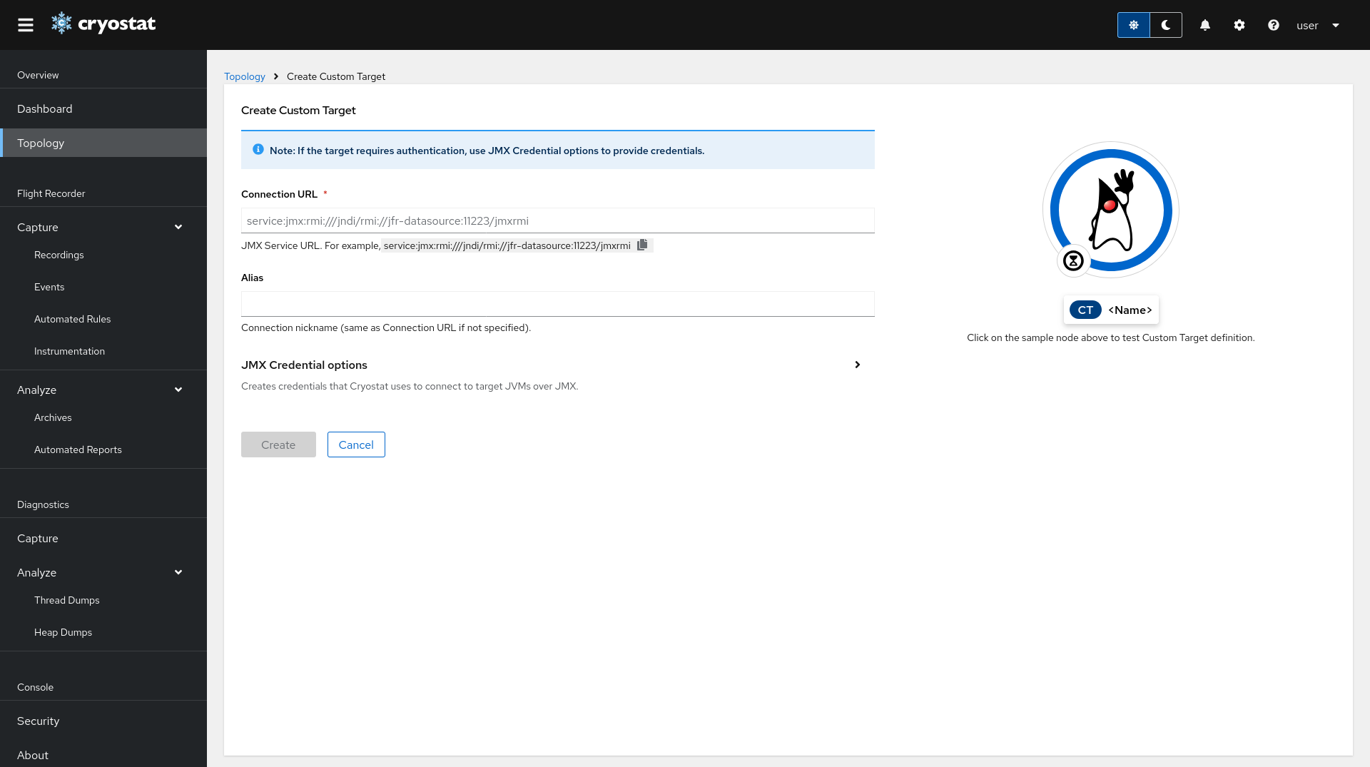 The alias, connectUrl, labels, annotations.platform, and annotations.cryostat properties are all guaranteed to be present on the target object. alias and connectUrl will be non-empty strings. The jvmId is a hash string computed by Cryostat after it successfully connects to a targetJVM and is used to uniquely identify that JVM instance - it will be empty if Cryostat has not yet connected to that target (for example, if its SSL/TLS certificate is not trusted or if Cryostat is missing the required credentials) The labels and platform annotations may be empty — in OpenShift or Kubernetes, these are populated from the labels and annotations applied to the target’s pod, if any. The Cryostat annotations map will vary per platform, but on OpenShift or Kubernetes you can expect the HOST, PORT, NAMESPACE, and POD_NAME keys to be present and non-empty. Take care to use the has or in operators when dealing with the labels and annotations map structures where specific keys may not exist.