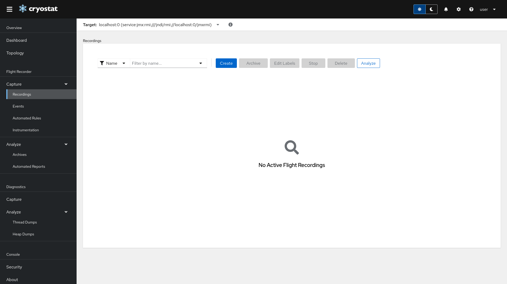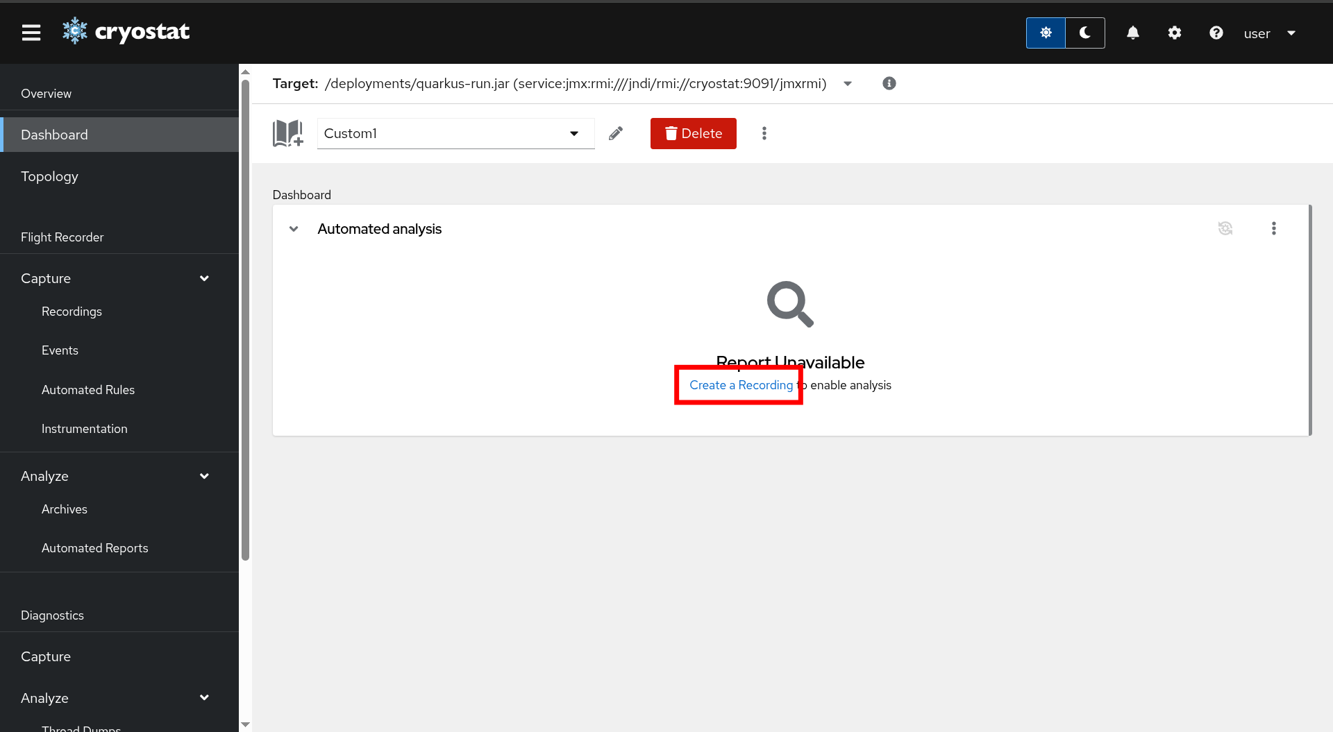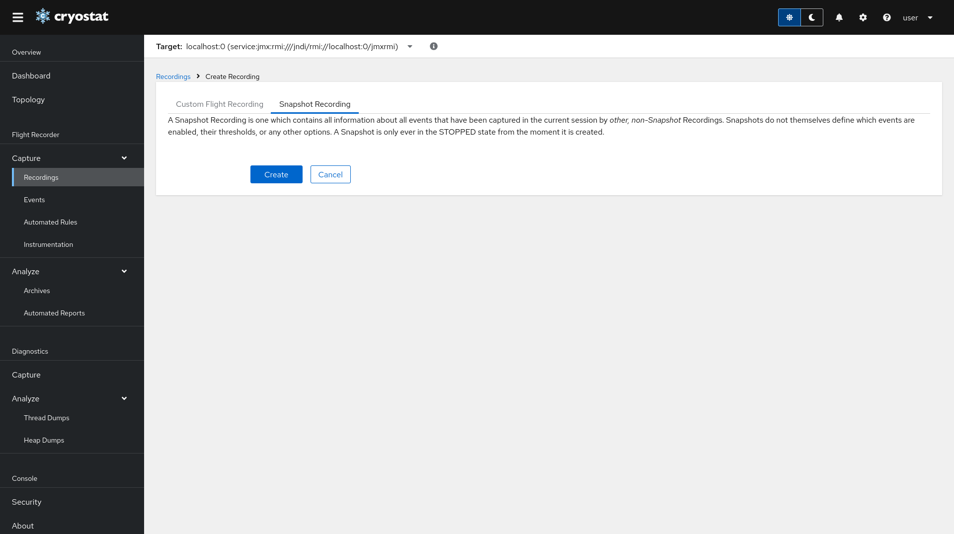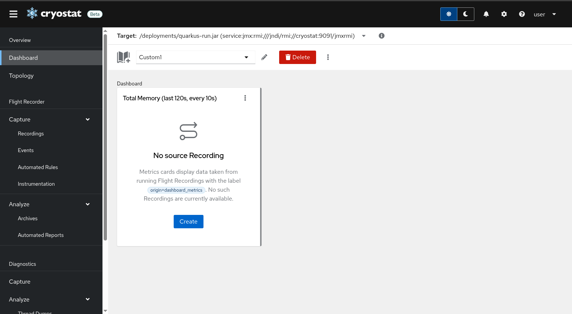 Click Create on the card to create a source Recording. Cryostat will walk you through creating the Recording. You can simply click through the form and accept the suggested default settings. This will begin a Flight Recording on the selected Target and send you to the Recordings view. Once you return to the Dashboard and the recording is available then Cryostat will begin to process and update the Recording to update the card visualization.