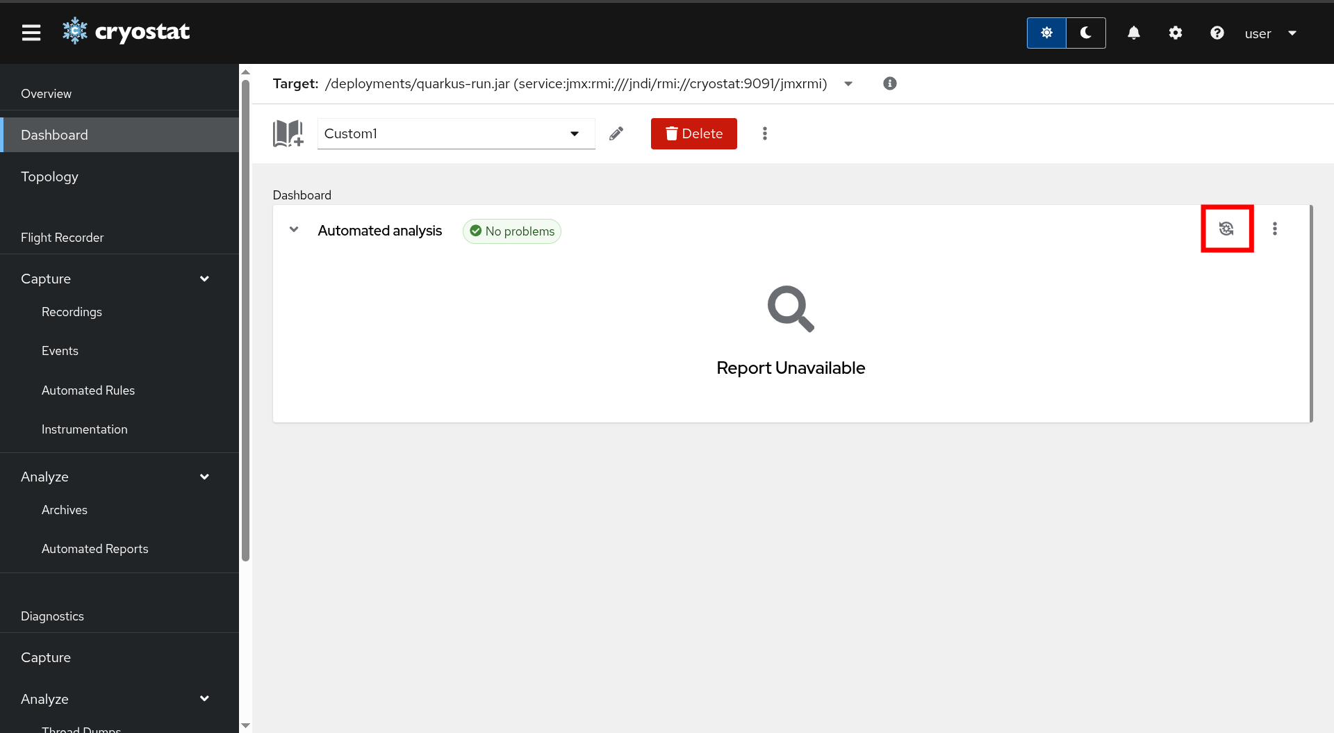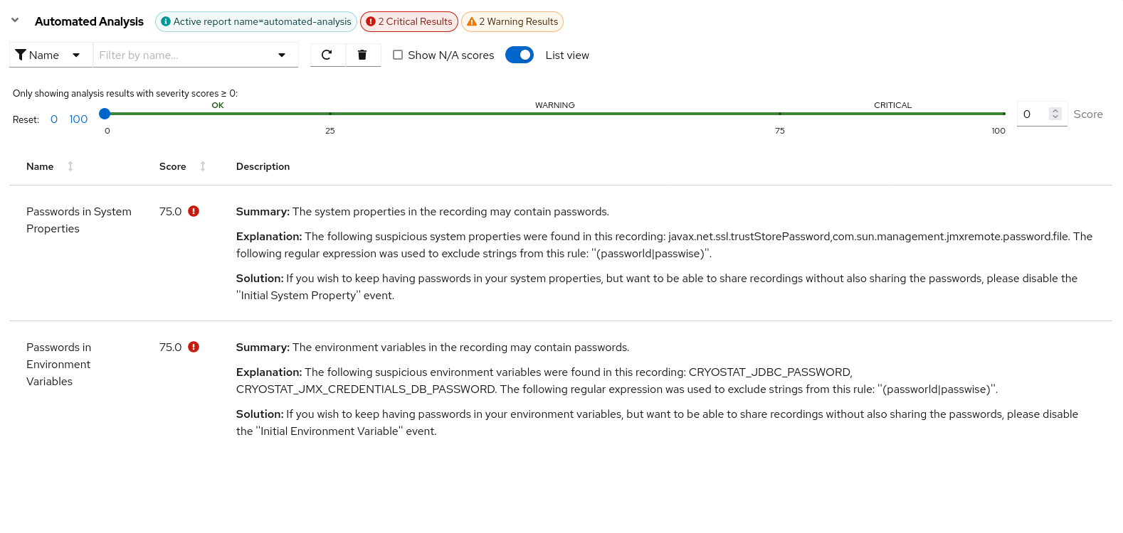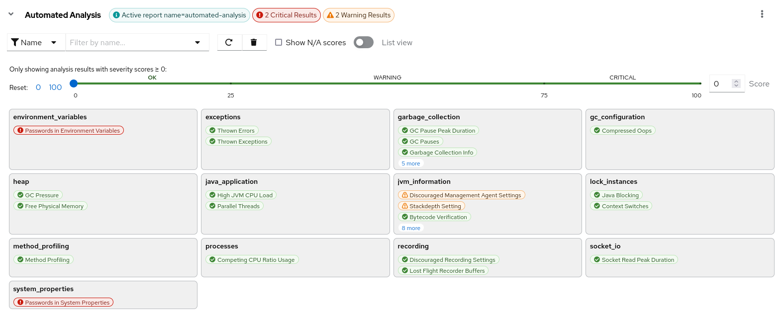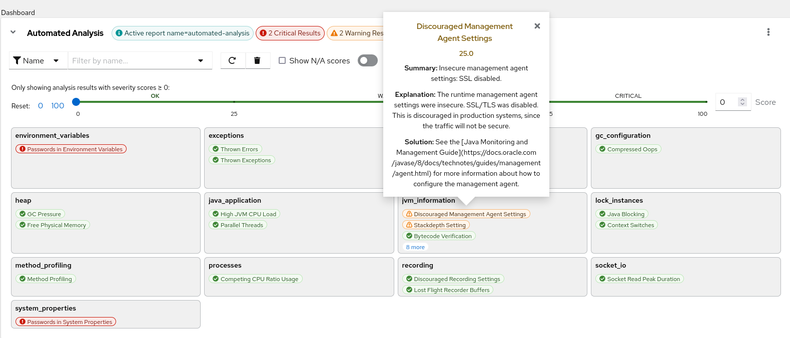 The Automated Analysiscard allows users to view JMCAutomated Analysis reports in a nicely formatted dashboard card. The card allows the user to create a special Recording, and then automatically generates an Automated Analysis report. The report displays potential problems with your JVM, and provides suggestions on how to improve the performance and security of your selected JVM application. The card also contains a toolbar that allows you to refresh the report, delete the report, filter results, and change the view.