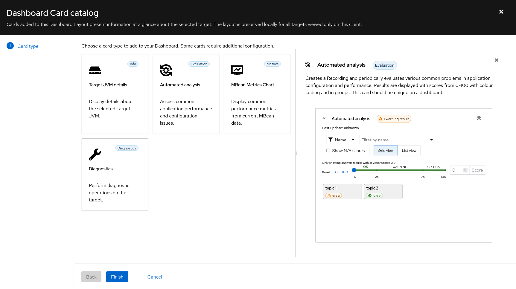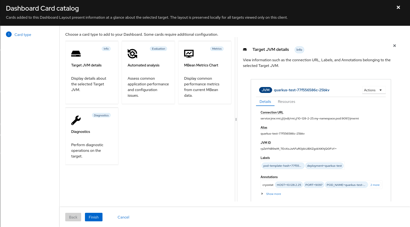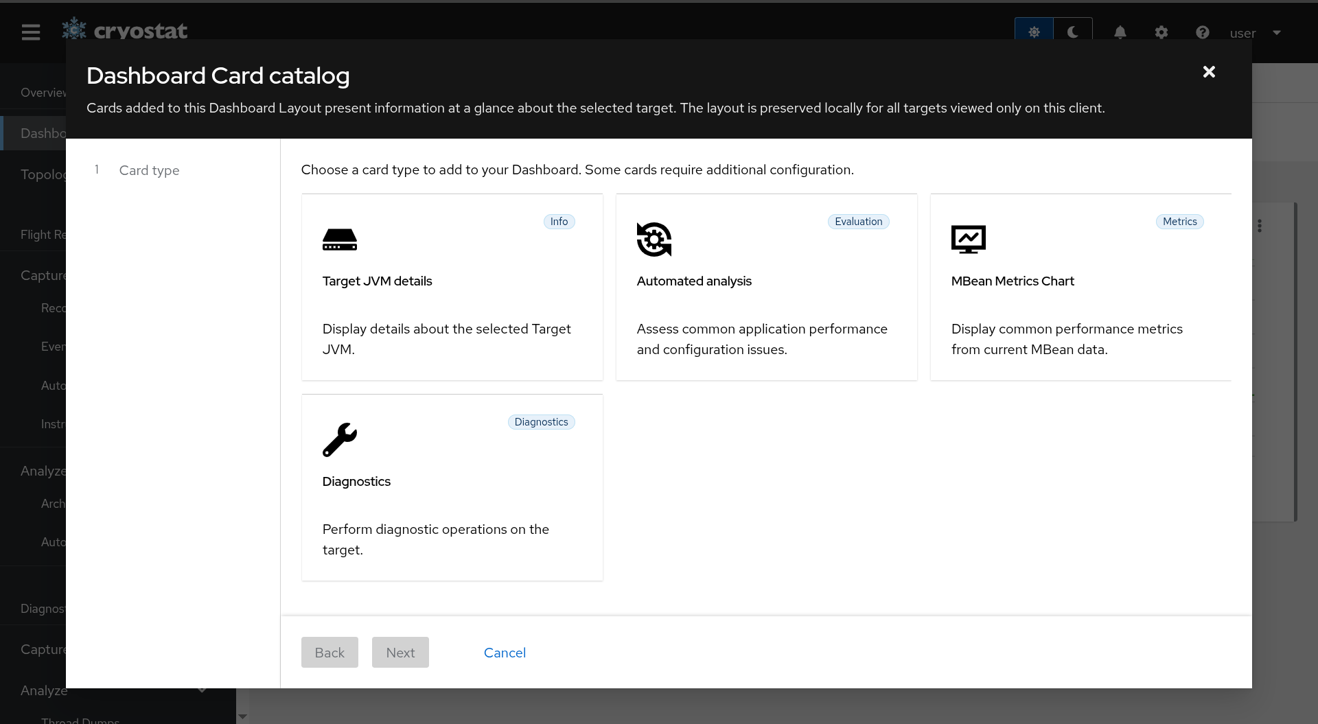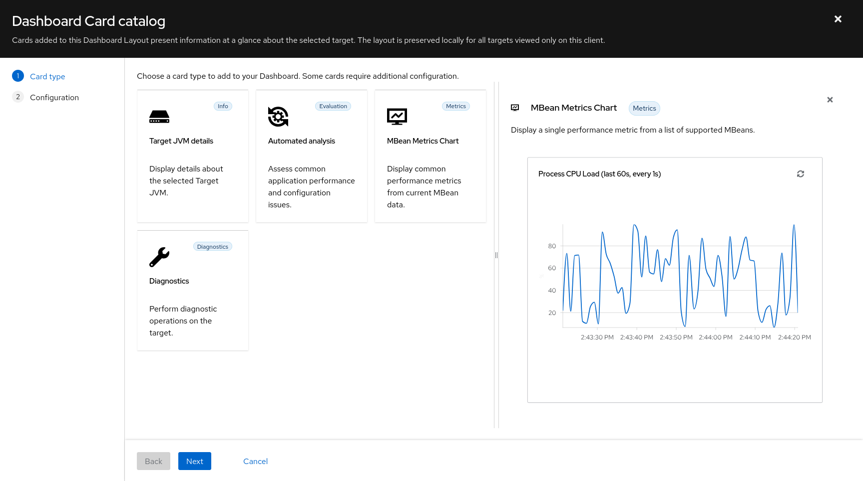 Cryostat gathers this data and displays them in various charts. You can customize each card by going through the card creation wizard. The wizard will guide you through the process of selecting the metrics you want to display, how you want to display them, and other various configuration options. Some examples of Performance Metrics that can be displayed are: