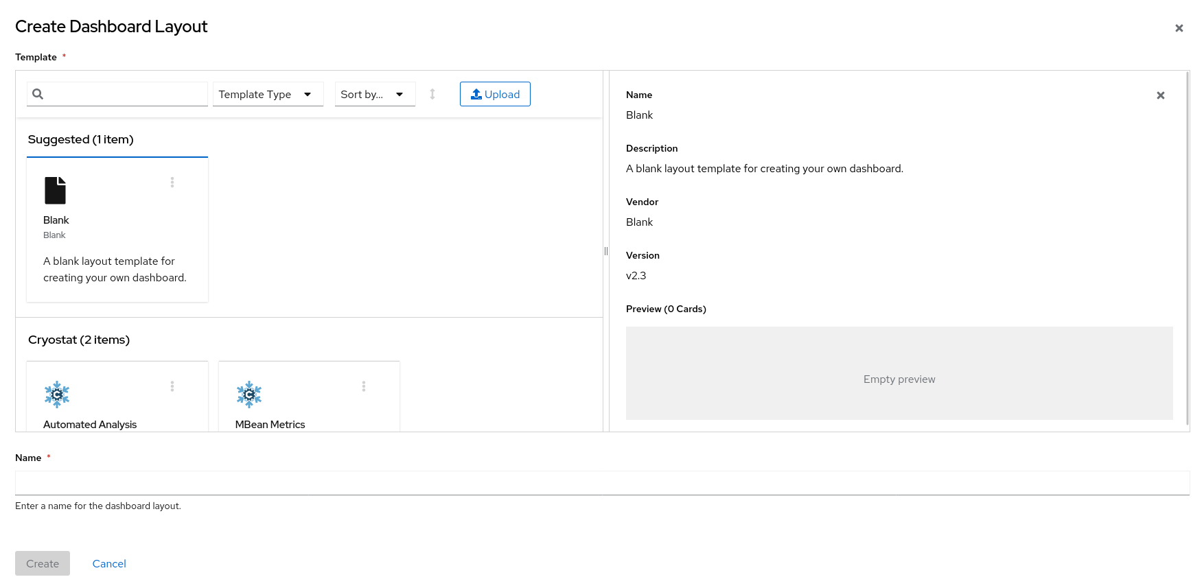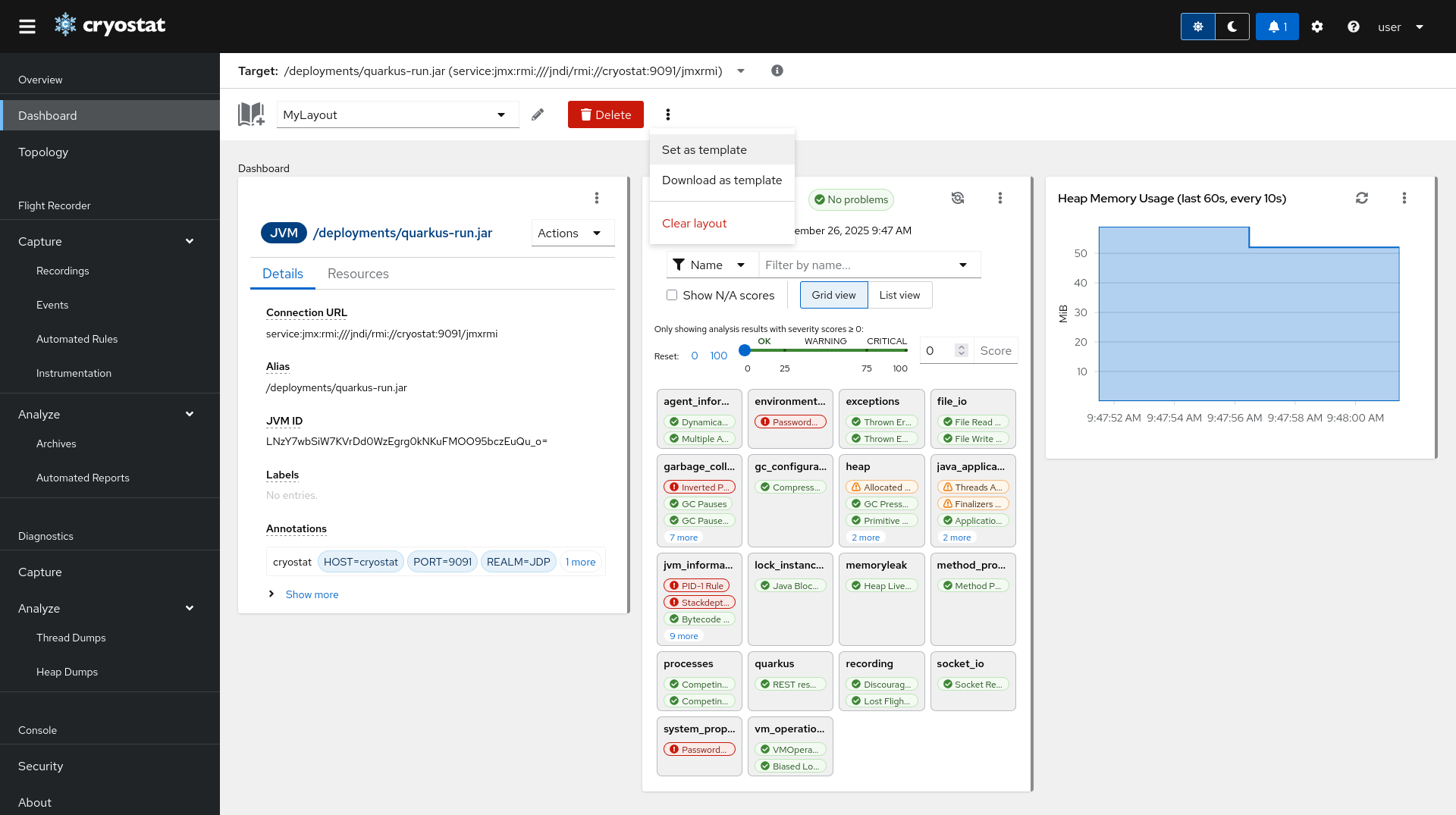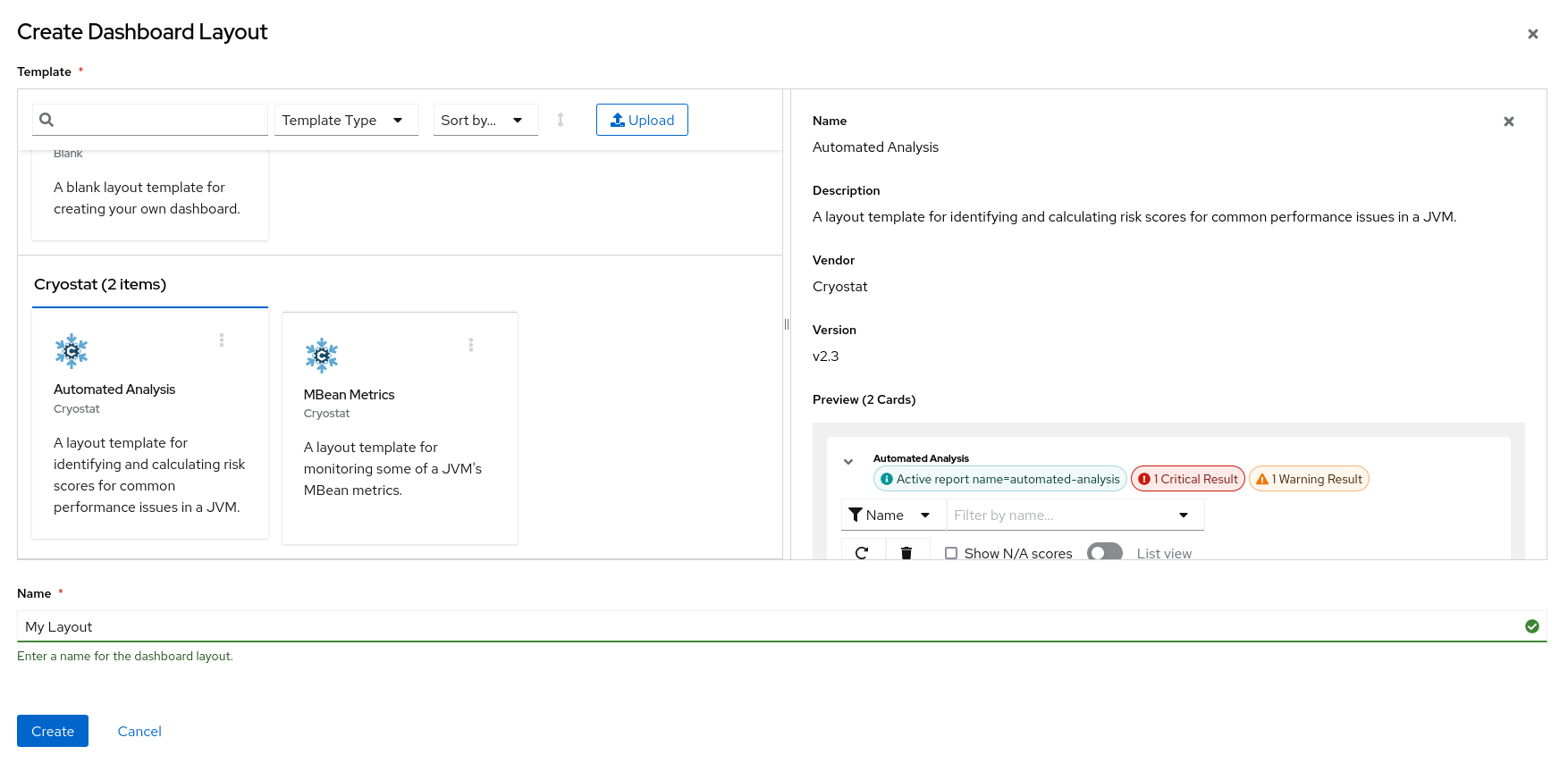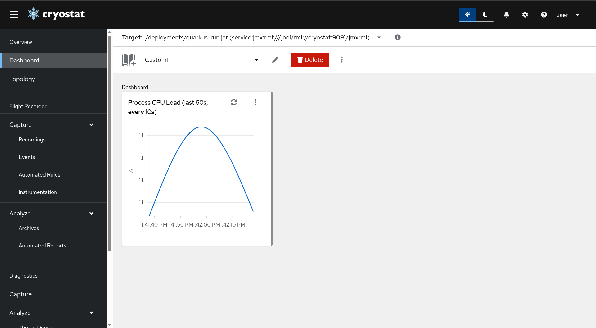 Cryostat gathers this data and displays them in various charts. You can customize each card by going through the card creation wizard. The wizard will guide you through the process of selecting the metrics you want to display, how you want to display them, and other various configuration options. Some examples of Performance Metrics that can be displayed are:
