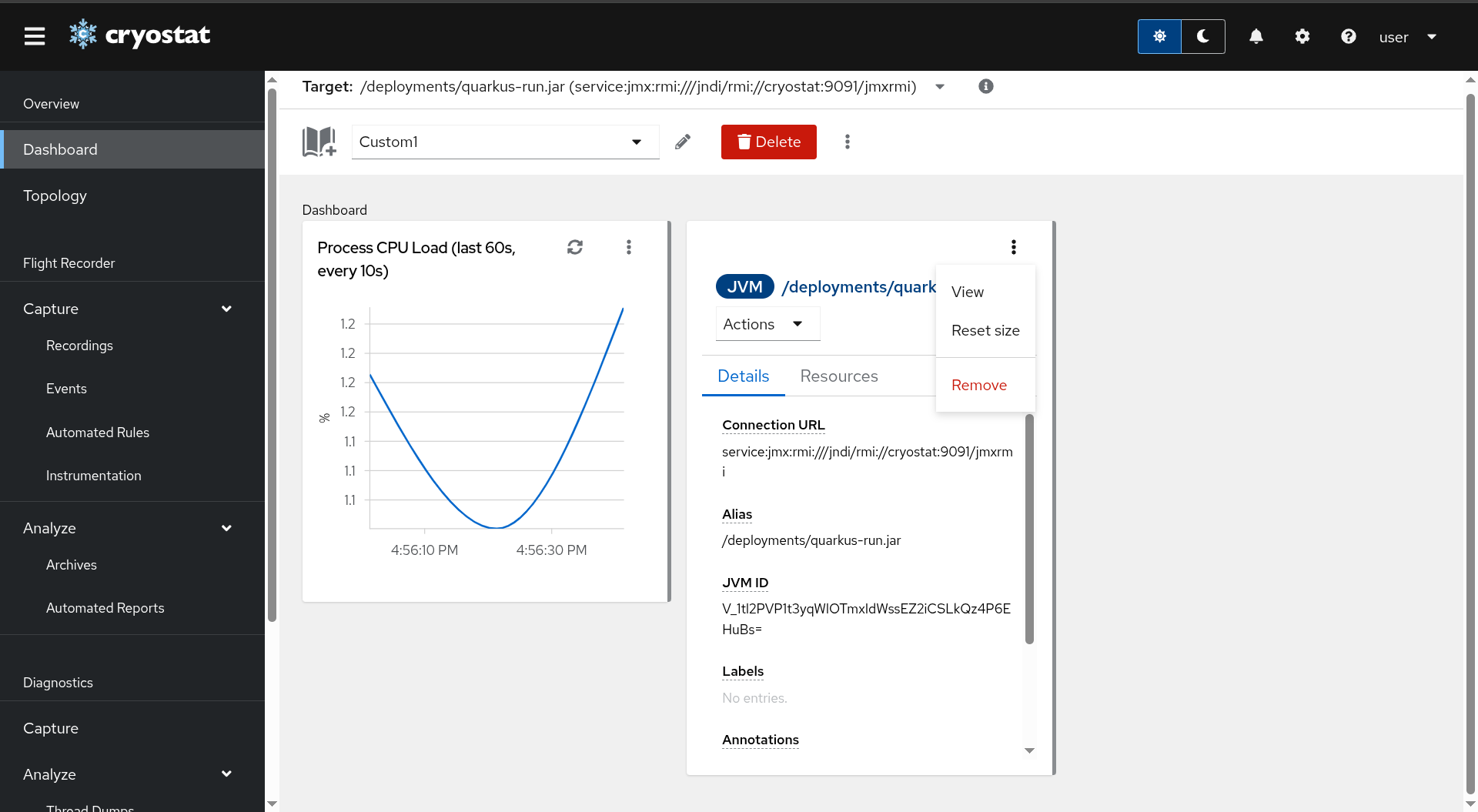 Dashboard cards are widgets that display information about your Cryostat instance and the targetJVM applications it is monitoring, or allow you to perform diagnostic actions against the targets. Let’s walk through the available cards and how to add them to your Dashboard.