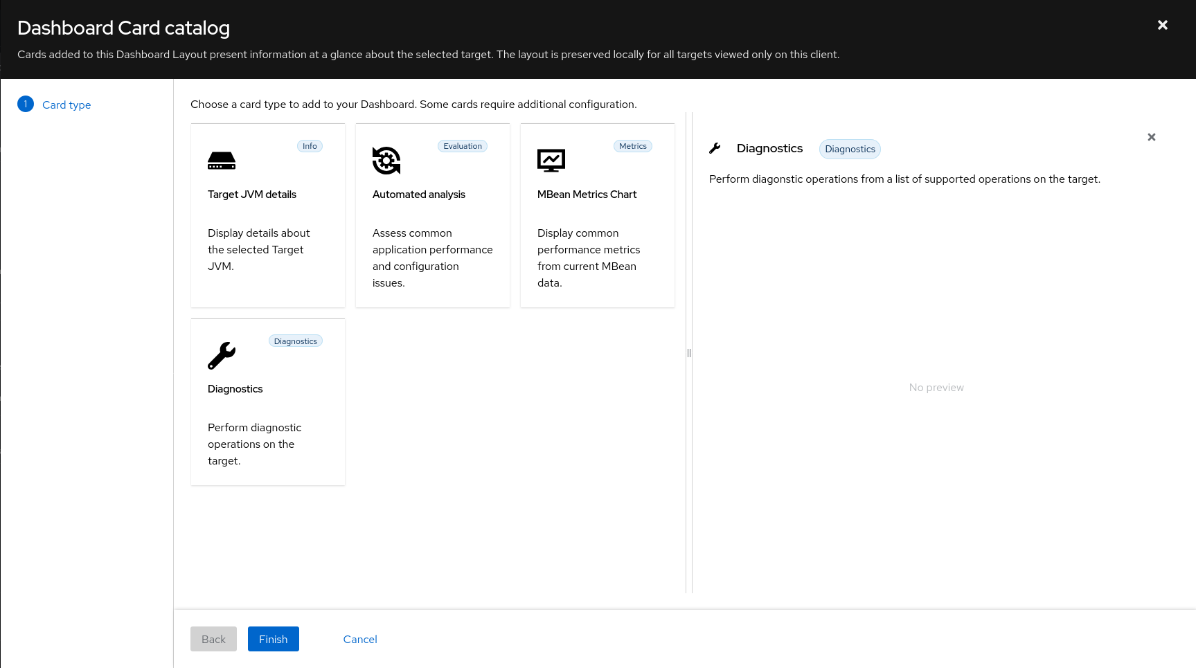The Dashboard Card Catalog contains a list of available cards that can be added to the Dashboard. Clicking on a card will open a panel containing a preview.