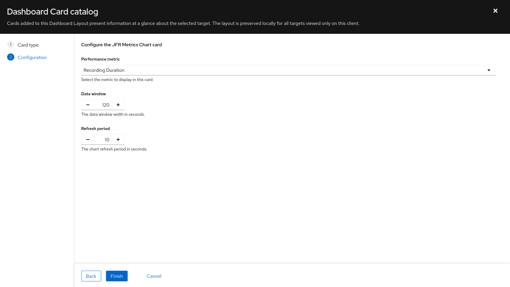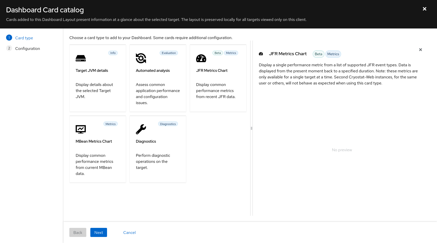 Add the JFR Metrics ChartCardClick on the JFR Metrics Chartcard. No preview is available.