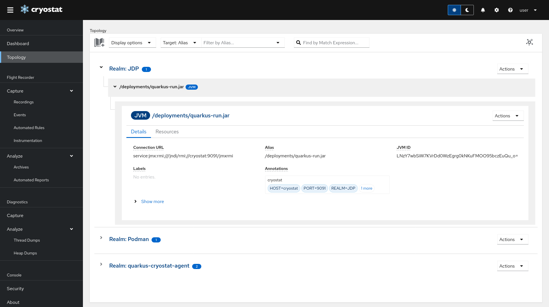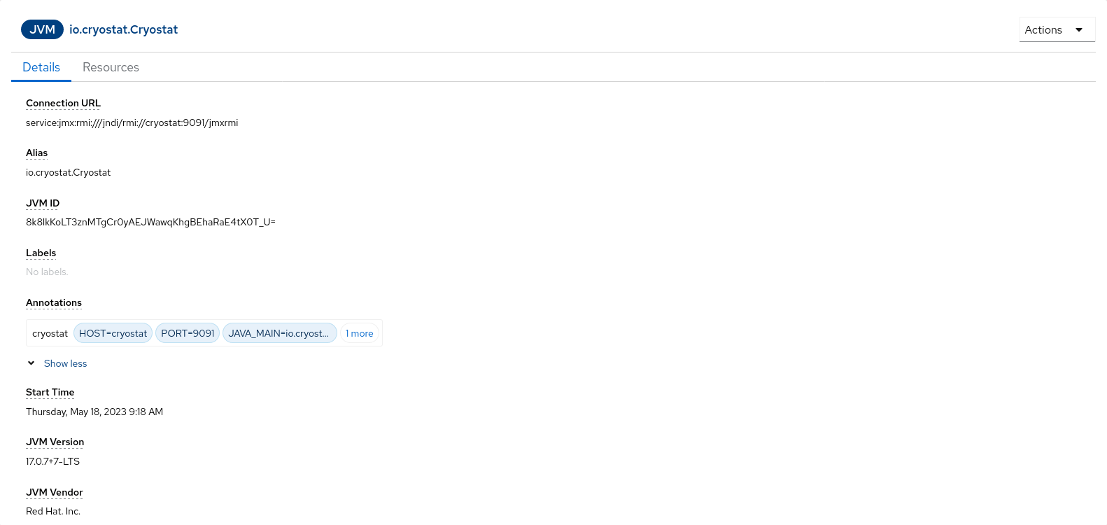 Note: An important caveat is that Cryostat does not watch for changes in the Kubernetes annotations or labels; it only watches to see if target applications appear or disappear. To apply the annotation to a target application, we must apply the annotation or label to the application pod (which will cause Kubernetes to roll out a new replica), and not to the deployment.