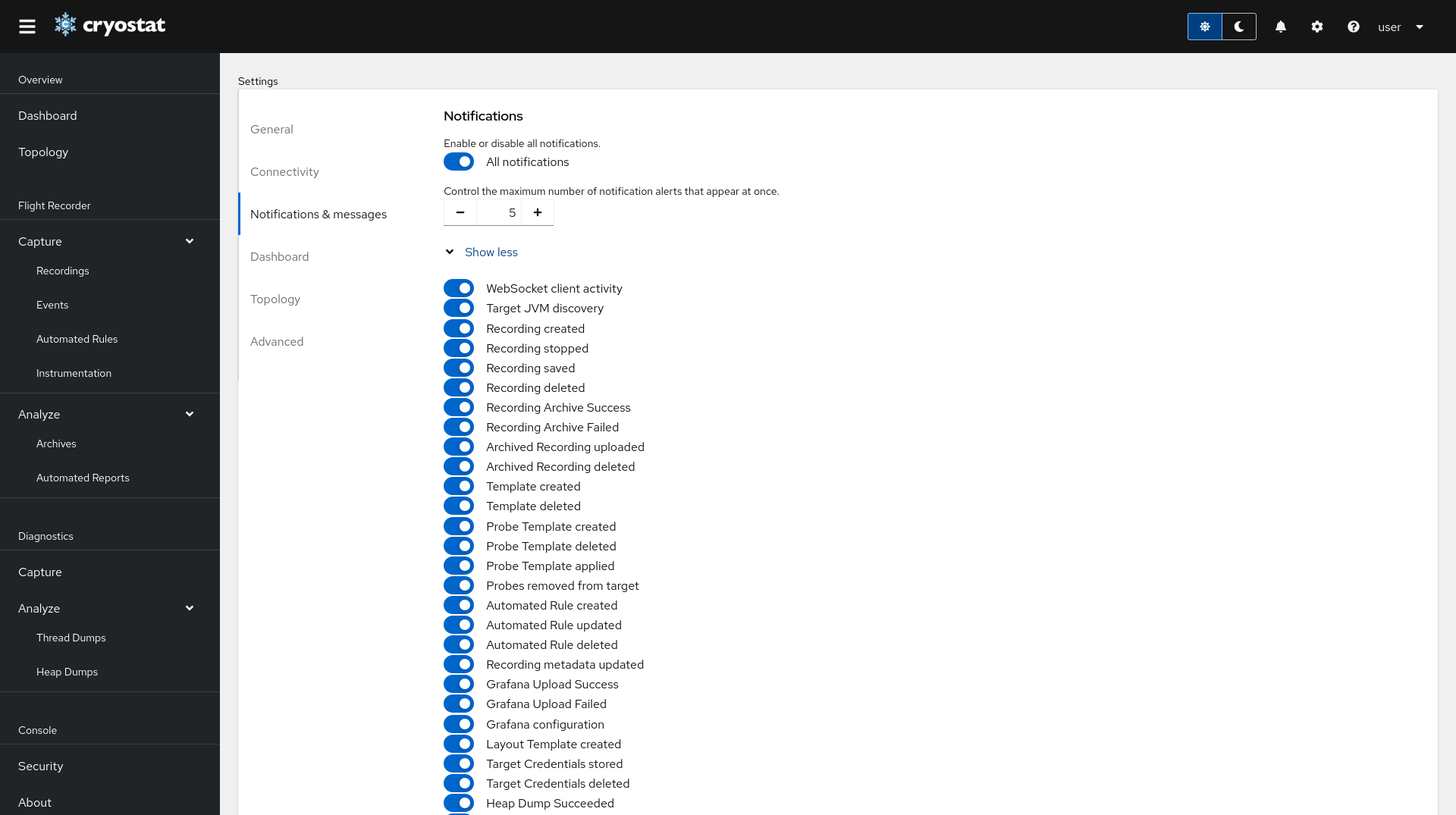 For those reasons, Beta features are hidden by default in the Cryostat UI. They can be enabled by following the steps below.