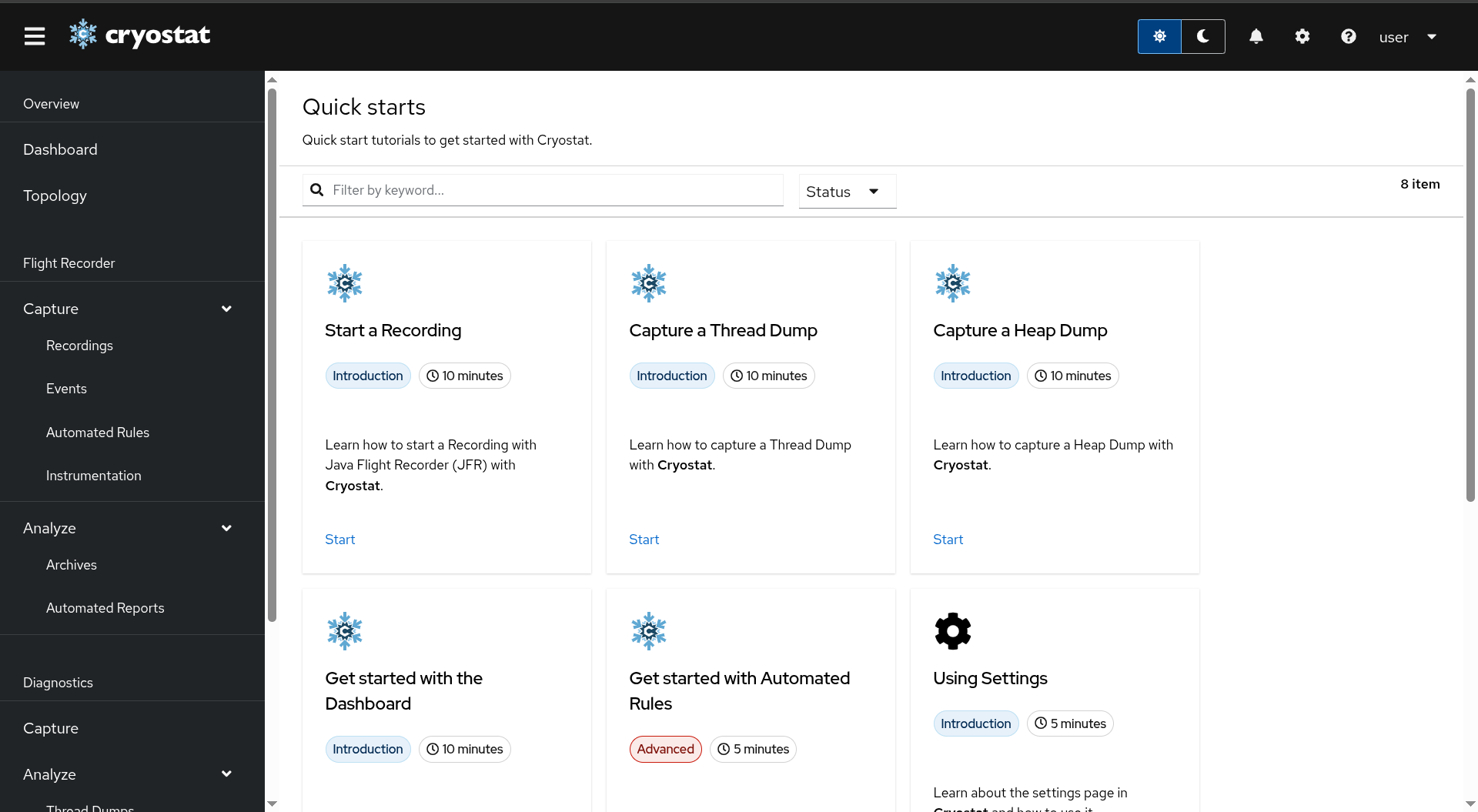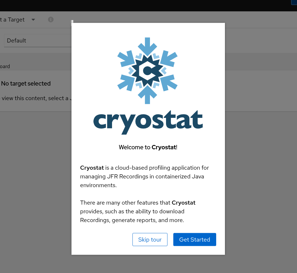 If you have not completed the tour previously and are unsure what Cryostat can do or how to use it, click Get Started