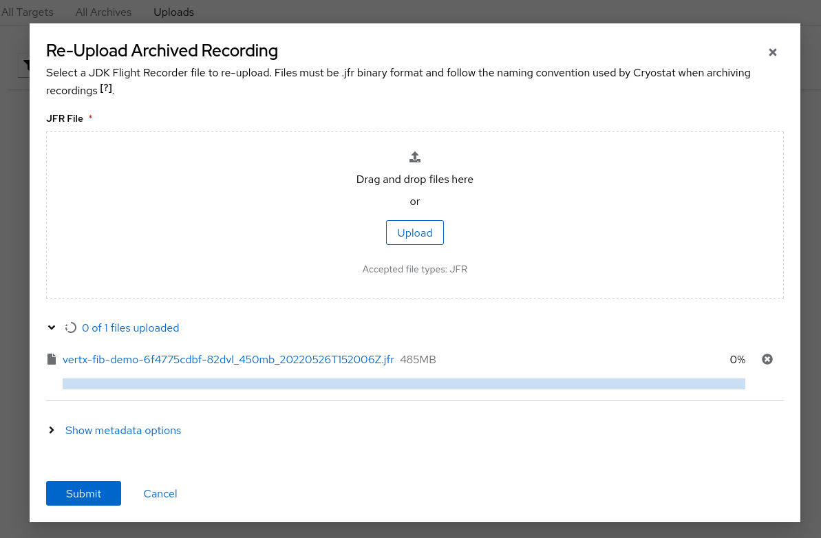 Once we’ve created this rule definition, Cryostat will check all of the existing target applications and watch for new targets that appear with the jfrMonitoring=enabled annotation. Any matching targets found will have a Recording started automatically using the Custom Demo template from our first use case. It will take an Archived snapshot every five minutes and maintain an hour’s worth of these archives in storage.