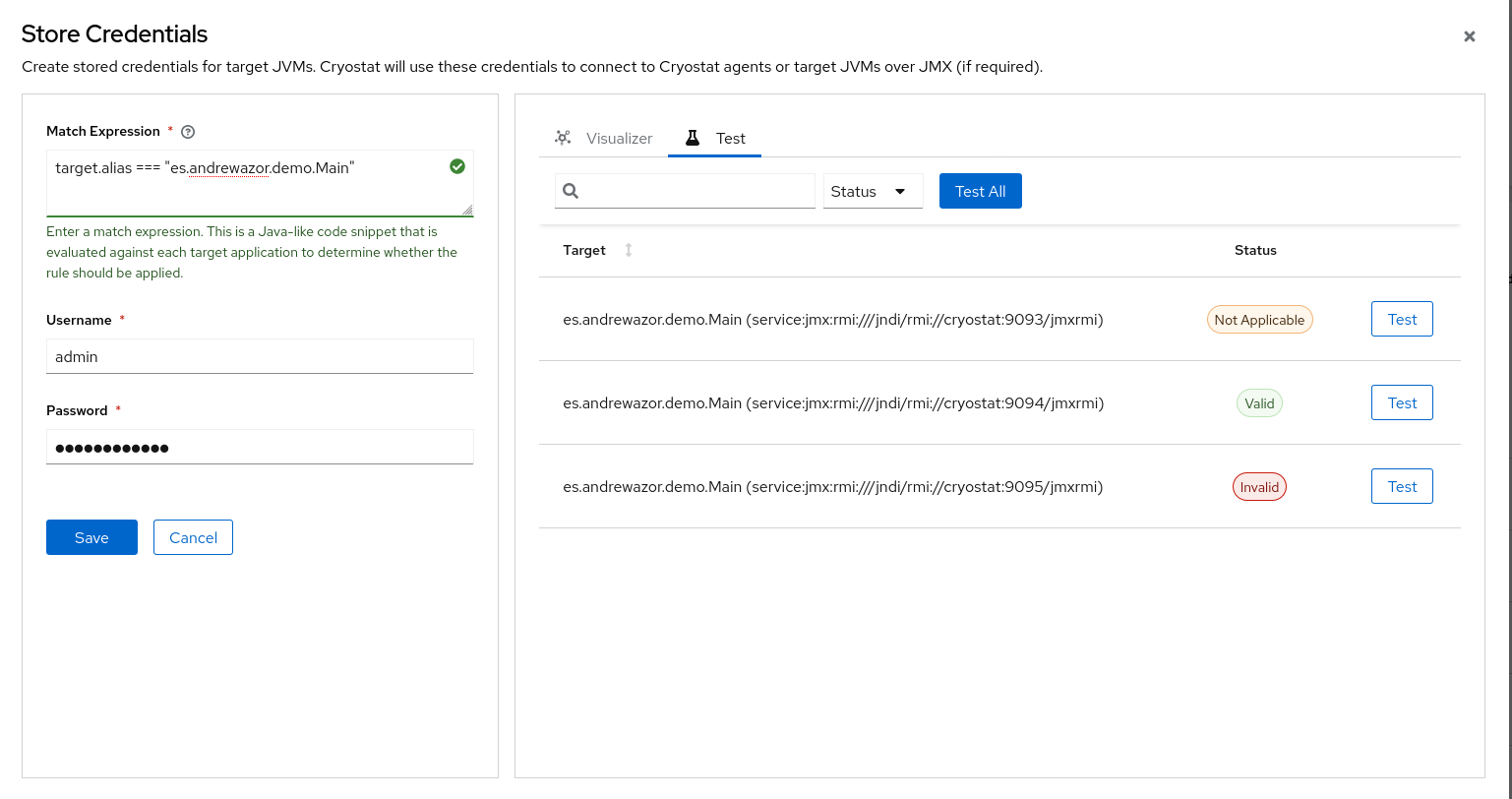 The Match Expression in a rule definition is a Common Expression Language expression that Cryostat interprets and uses to determine if a rule should be applied to any given target. Match Expressions should thus evaluate to a boolean value. The simplest Match Expressions would be the booleans true or false; if we use true, the rule will apply to every target. The Expression has a target object in global scope, with the following form in JSON notation: