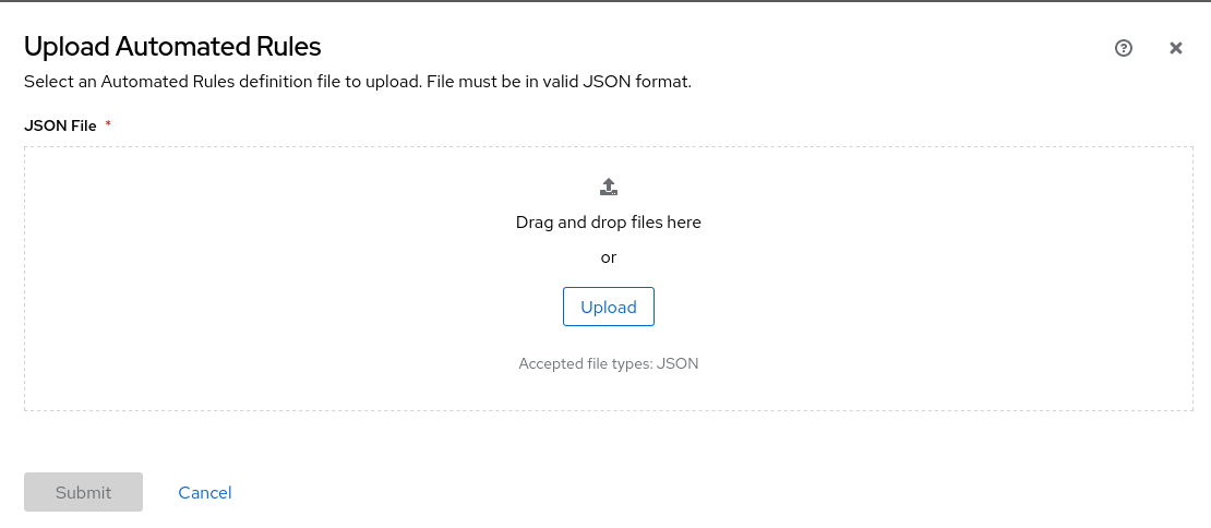 Attach a Rule File by Dragging & Dropping or clicking Browse....Select a rule file to upload. The file should not include the "id" field as this will be assigned by the application database.