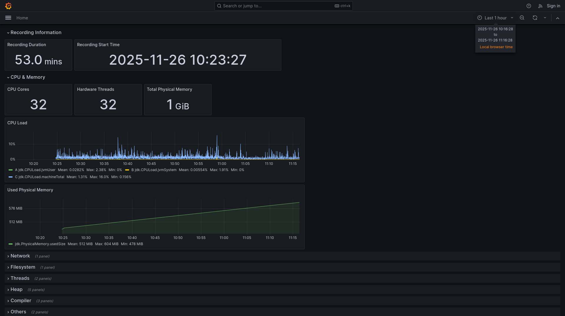 The JFR Metrics Chartcard displays performance metrics about the targetJVM by visualizing JFR data snapshots via embedded Grafana visualization panels as Dashboard cards. This is a Beta-level feature. A significant limitation of this card is that it depends upon the stateful jfr-datasource backend component, which only converts one Flight Recording file at a time to Grafana data. Therefore, this card does not behave well if multiple web-client instances are open at the same time, whether used by one user or multiple human users.